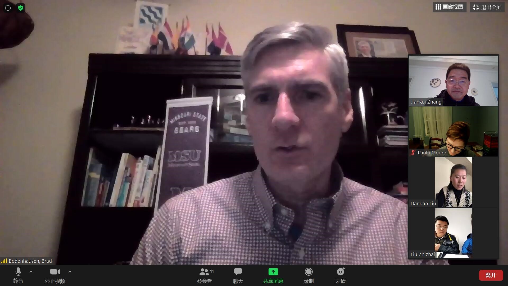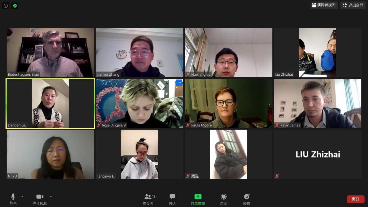 在公司与美国密苏里州立大学(MSU)双方的共同努力下,植物科学与技术专业的英语课程教学稳步有序推进。为及时反馈教学效果,确保教学质量,合作双方于北京时间2月2日上午9:00召开了线上教学研讨会,MSU助理副董事长Brad Bodenhausen、英语教师Paula Moore、Kevin James、Angela Rose及公司中外合作办学相关教师参加,会议由MSU国际领导力培训中心主任Dandan Liu和公司中外合作办学办公室主任刘志斋主持。