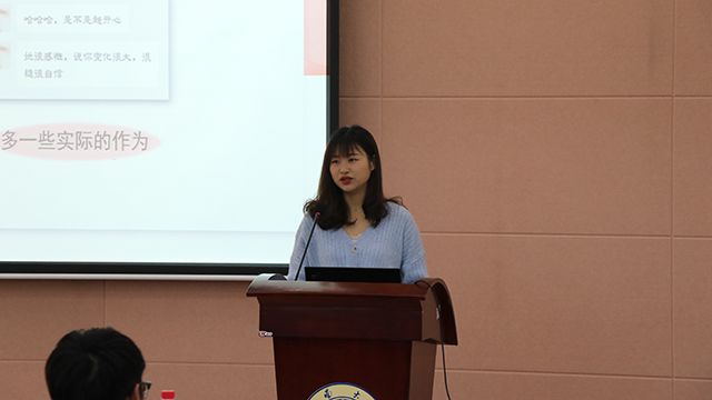 紧接着,来自马克思主义公司的王钰洁同学向同学们讲述了她的故事。从天生缺陷的低估起步,到如今破茧成蝶的蜕变,王钰洁凭借着自己踏实的勤奋努力,多次获奖学金,同时也荣获全国老员工马克思主义理论学习夏令营优秀营员、太阳成集团tyc234cc优秀员工标兵等荣誉称号。她告诉同学们遇到自己天生的不足,要学会去克服。找到自己路,做好自己的本分工作,一步一步地向前,总能成功。