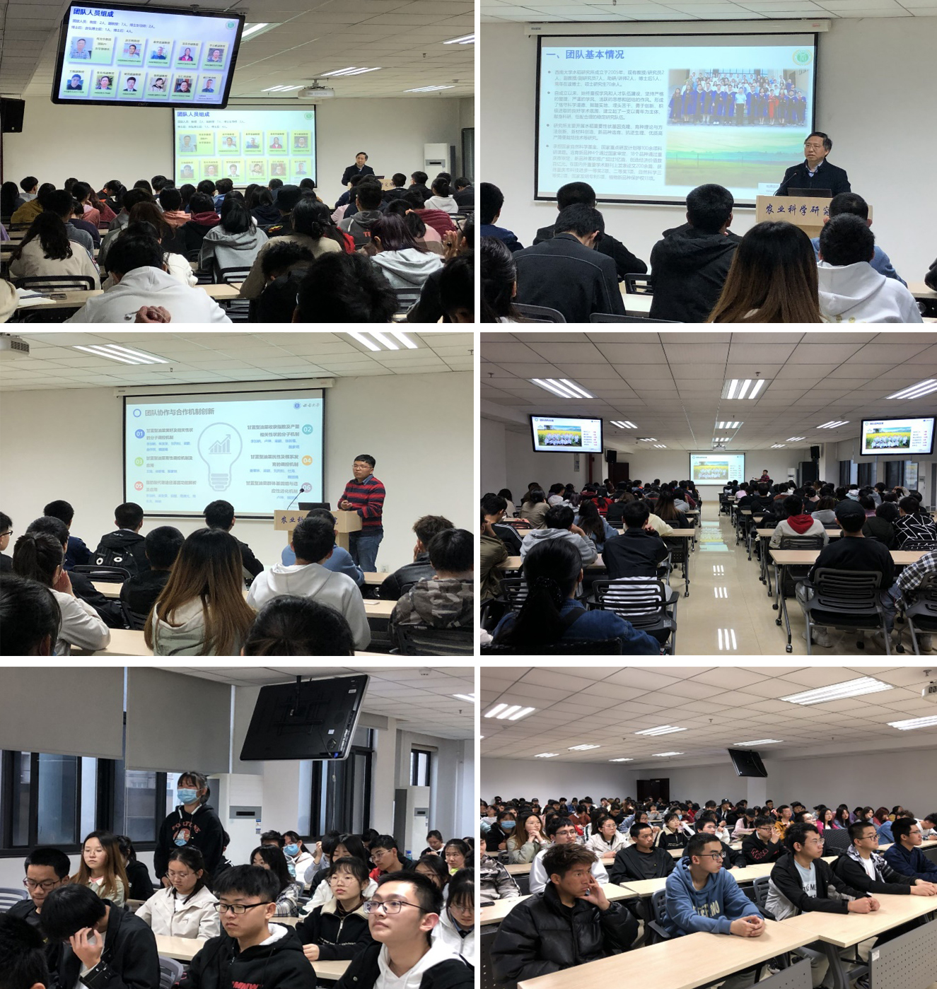 第二阶段,聆听水稻和油菜团队学术报告。在隆平楼205报告厅,何光华教授以“袁隆平的中国梦”为主题作了报告,向同学们讲述了水稻研究团队的科研方向以及想要实现袁隆平的中国梦的目标和期待。接着曲存民副教授从团队建设进展、研究成果等各方面给同学们介绍了油菜研究团队。同学们踊跃发言提问,提出了自己的疑惑,发表自己的见解和看法,现场氛围非常活跃。