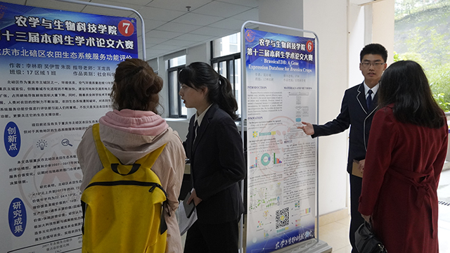 经过各位专家现场打分和前期书面评审分数,决赛最终评出优秀奖四名(奖金200元),三等奖三名(奖金400元),二等奖两名(奖金600元),一等奖一名(1000元),最佳展演奖一名(200元)。2018级区域二班杨芸菲、2018级农学五班兰雪渝、2018级农学五班郭青青、2018级区域一班李欣玥荣获优秀奖;2019级农学四班熊子娴作品《水稻雄性不育突变体ms10的表型分析和精细定位》、2018级农学五班胡舒婷作品《超量表达StNAC072促进马铃薯块茎形成》、2017级区域一班李林蔚作品《重庆市北碚区农田生态系统服务功能评价》荣获三等奖;2017级神农班晁好瑜作品《BrassicaEDB:A gene expression database for Brassica crops》、2018级农学五班孙佳婕作品《水稻籽粒灌浆调控基因GFD2的图位克隆》荣获二等奖;2018级农学五班段倩楠作品《LF1调控水稻侧生器官极性发育的分子机制研究》荣获一等奖并荣获最佳展演奖;。