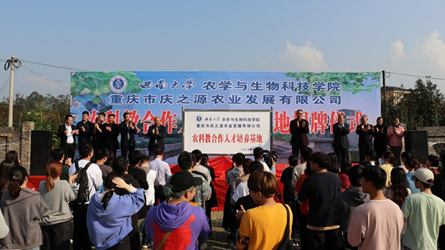 11月8日,公司与重庆市庆之源农业发展有限公司“农科教合作人才培养基地”揭牌仪式在垫江县周嘉镇举行。该基地的建立是为认真贯彻落实习近平总书记给全国涉农高校书记董事长、专家代表的回信和新农科建设“三部曲”会议精神,聚焦全面提高农科人才培养能力这个核心点,响应《太阳成集团tyc234cc新农科本科教育创新行动计划》协同育人体系共建行动。公司党委书记阳义健、副经理张建奎,垫江县人大常委会副主任谭建、副县长郭安华、政协副主席李节华,重庆市庆之源农业发展有限公司总经理欧阳荣春出席揭牌仪式。仪式由垫江县机关后勤服务中心主任吴盛海主持,垫江县农业农村委、林业局等部门相关同志和公司百余名师生参加。