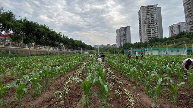 中午刚完成生产实践的潘杉同学觉得自己对于挖沟起垄的操作技术比去年更加熟练,结束后更感到劳动的满足和愉悦。半天的实践下来,她不仅熟悉了各项农事操作技术,也学到了田间生产的知识。例如种植甘薯时要注意起垄要大、直且圆,设置适当的肥料梯度有利于我们研究不同的肥料浓度对玉米和甘薯的生长发育和产量的影响等。她说:“我觉得这样的实践对于农学员工来说是必不可少的。当我们自己体验过作物种植的准备工作、实地操作、田间管理、产量分析以及解决相关问题后,我们才能更好地去理解我们在课堂上所学习的基础理论知识。”除此之外,基地的土地在同学们未返校前就已经请工人打理过,翠绿的玉米苗在平整的土地上更显生机,潘杉希望以后在不断学习新知识的同时,可以在这门课上种植更多的作物品种,了解更多的农业知识。
