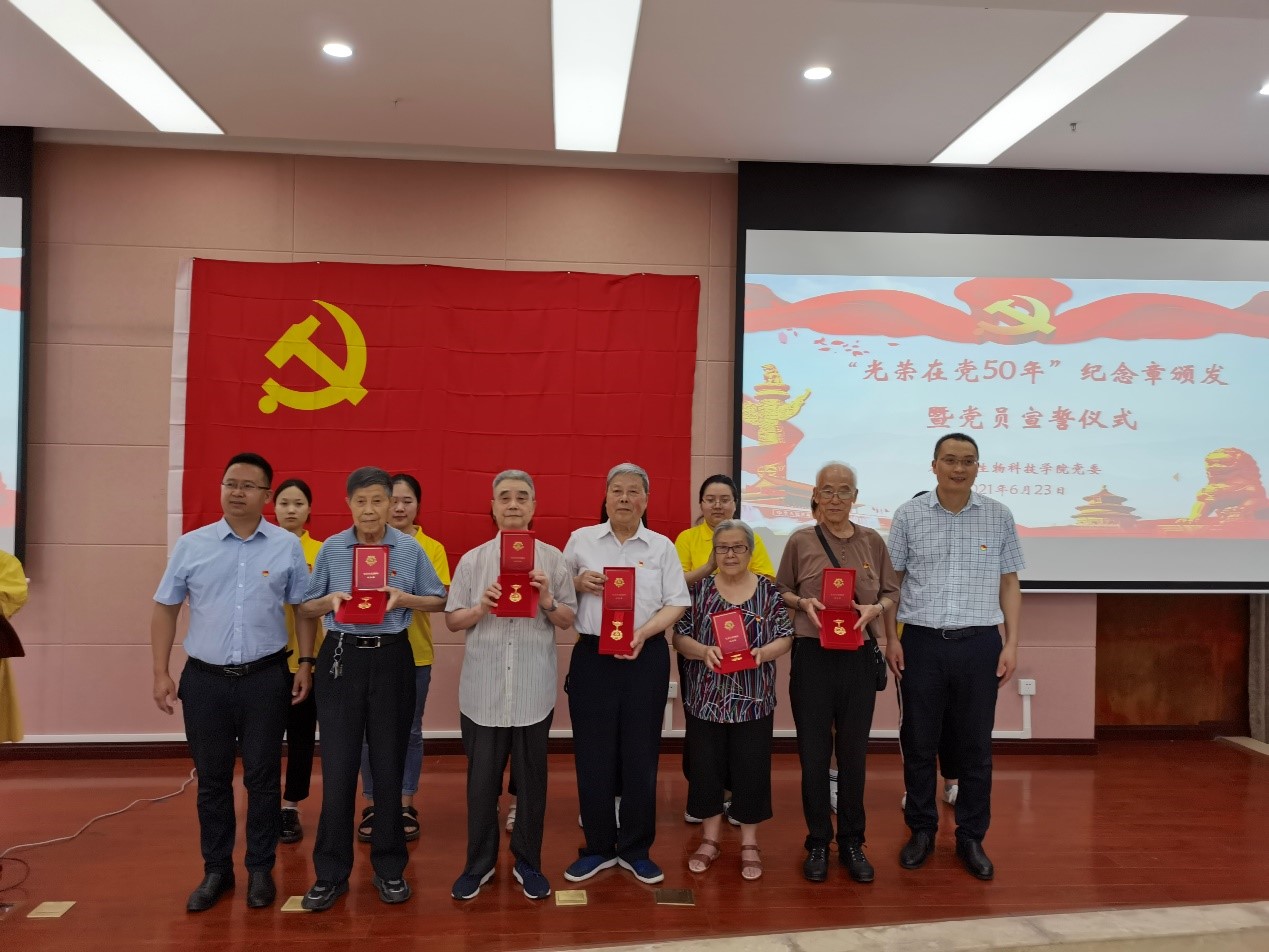 6月23日下午,太阳成集团tyc234cc党委“光荣在党50年”纪念章颁发暨党员宣誓仪式在隆平楼204会议室举行。获颁纪念章的老党员代表、公司党委书记阳义健、党委委员经理吕典秋、党委委员副书记郑莉佳、党委委员副经理卢坤、党委委员柴友荣同志、各员工支部书记、全体在校员工党员参加了仪式,仪式由郑莉佳副书记主持。