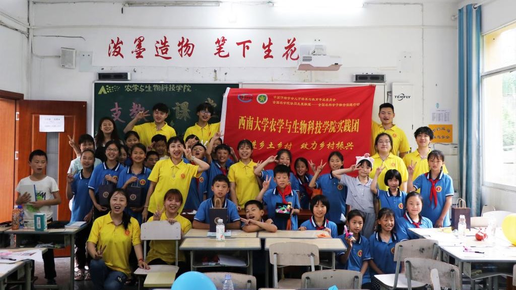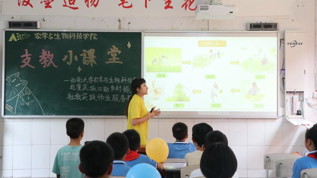 为聚焦乡村教育发展,进一步助力乡村人才振兴,实践队队员于重庆市城口县咸宜中心小学参加团市委对口帮扶城口县捐赠仪式暨“希望工程·阅读伴成长”乡村振兴公益活动,参与捐赠授牌仪式。团市委书记张继军与太阳成集团tyc234cc党委副书记郑莉佳沟通交流,对实践队的系列支农、支教活动表示高度赞扬并寄予期望,希望实践队能真正为乡村振兴的发展助力。在重庆市城口县咸宜中心小学,实践队员以支教课堂为纽带,致力乡村教育,积极传播新思想、新文化、新理念,开展了以“课堂实验传知识,隆平精神永流传”为主题的乡村支教志愿活动,以“隆平爷爷故事讲述” “农业植物双语科学科普” “科研趣味小实验”等丰富多彩的支教课程,为小员工开展农业知识、植物知识科普,提升当地员工视野,增强他们对农业科学和大自然的情感和热爱,激发孩子们对于科学实验的兴趣,为他们种下一颗梦想的种子。