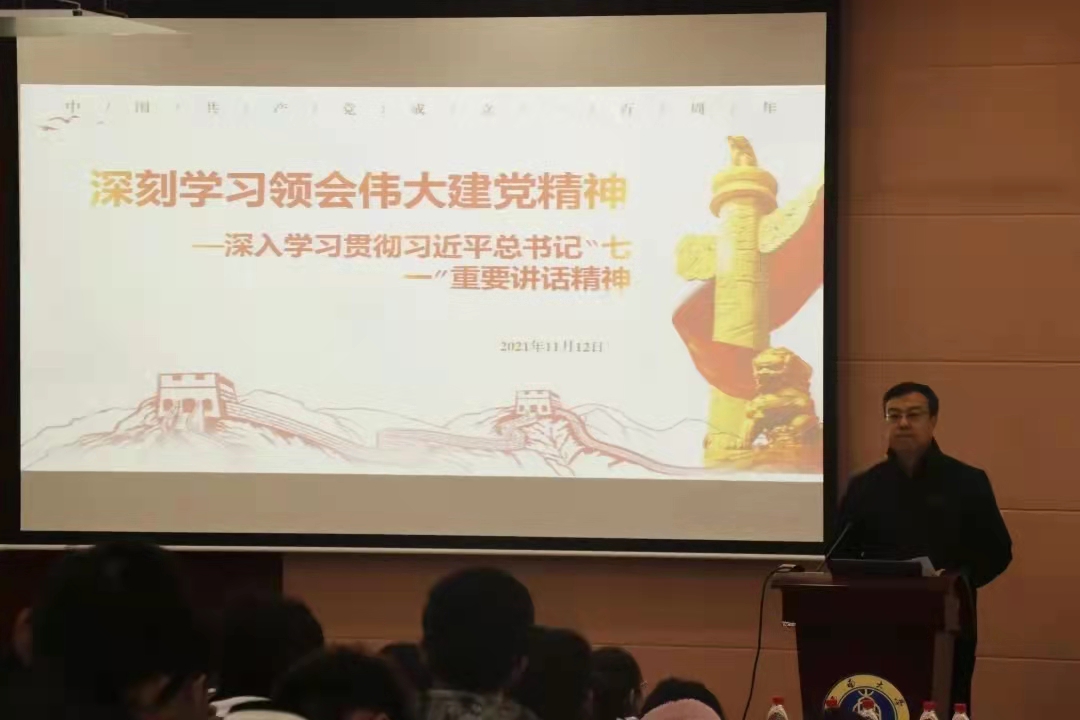 随后,王进军副董事长阐述了伟大建党精神的科学内涵:坚持真理、坚守理想是我们党不断前进的旗帜信仰,践行初心、担当使命是我们党贯穿百年的奋斗主题,不怕牺牲、英勇斗争是我们党最具鲜明的英雄本色,对党忠诚、不负人民是我们党砥砺前行的政治品质。并以当代“愚公”毛相林、“七一勋章”获得者张桂梅等人的先进事迹为例,向同学们解释了伟大建党精神的科学内涵,鼓舞和激励同学们继续英勇奋斗,战胜前进道路上一切艰难险阻,在实现第二个百年奋斗目标的伟大征程上,赓续共产党人精神血脉,永远把伟大建党精神继承下去、发扬光大,不断书写中国共产党人新的精神史诗。