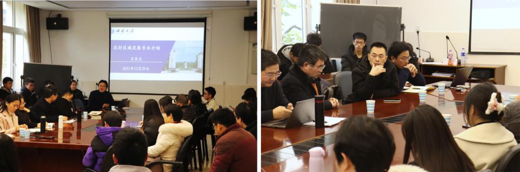 会议伊始,区域系主任吕长文就农村区域发展专业的历史背景、优势特色、培养目标、课程设置、团队力量、发展前景等为大家展开详细讲解。吕长文指出,未来在乡村振兴的战略下,区域专业具有相当的优势与前景,农村区域发展专业大有可为!随后,区域系副主任袁晓辉从个人角度出发,为同学们分享了自己的工作经验和学习经验,希望同学们面对任何情况都需要提高自身的调适能力,对专业、对学习要有正确认知的逻辑起点,人生应充满正能量,更应珍惜时间,努力拼搏,学好专业,树立一个目标,立大志、立长志。