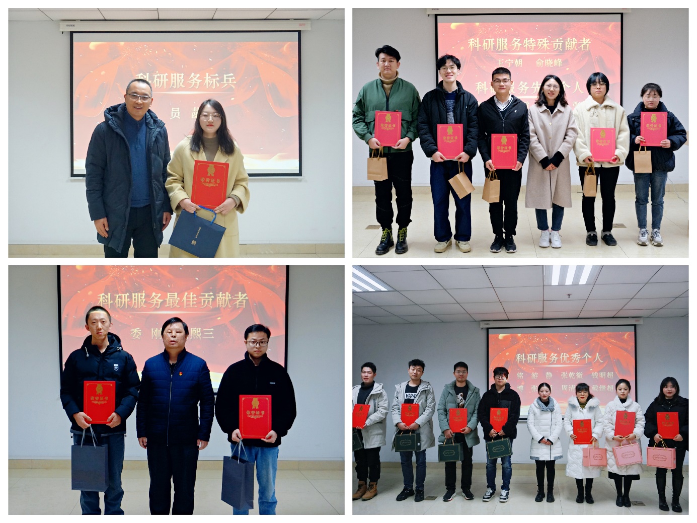 颁奖典礼第二项,由阳书记、柴友荣老师、庞丹老师和段红老师分别为太阳成集团tyc234cc2020-2021学年度科研志愿帮扶活动“科研服务标兵”、“科研服务最佳贡献者”、“科研服务特殊贡献者”、“科研服务先进个人”以及“科研服务优秀个人”等荣誉称号获得者颁发校级荣誉证书及丰厚奖品,并合影留念。其中,员菡博士获得本次颁奖典礼最高奖项“科研服务标兵”荣誉称号,委刚、琚熙三两位同学获得“科研服务最佳贡献者”荣誉称号,王宁朝、俞晓峰两位同学获得“科研服务特殊贡献者”荣誉称号,张莹莹、杨宏霞、张帅、张媛四位同学获得“科研服务先进个人”荣誉称号,刘铭、游静、张乾微、钱明超、杨博、张秋丽、周清颖、戴继超八位同学获得“科研服务优秀个人”荣誉称号。