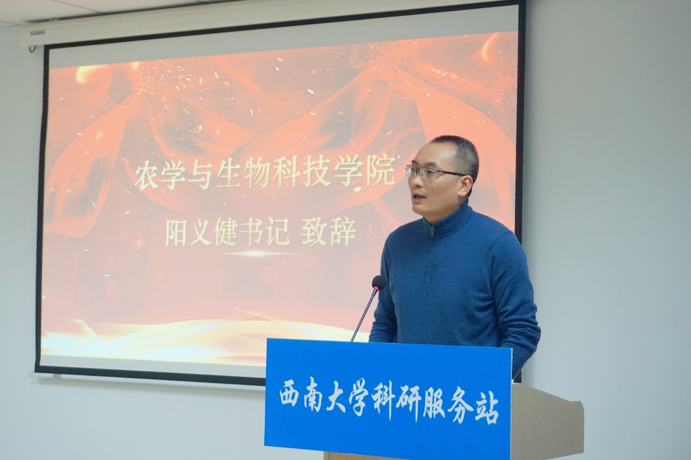 颁奖典礼第一项,由农生公司党委书记阳义健老师作颁奖典礼开幕致辞。阳书记首先对服务站的建设成果表示高度肯定。阳书记指出,服务站将党建与科研帮扶有机融合,在较短的时间里创新性完成了服务站的组建以及规范化的科研帮扶制度建设,行动迅速且成效显著,具有很强的引领示范作用。随后,阳书记为服务站后期建设提出三点中肯建议,一是要进一步规范运行流程,以确保服务站的长期稳定运营;二是要不断扩大服务站的影响力,争取为全校师生提供高质量的科研帮扶;三是树立帮扶者典范,收集受助者典型案例,持续宣传帮扶者的模范事迹。最后,阳书记对各位获奖同学表示衷心祝贺,并寄语获奖同学和全体服务站成员们要珍惜现有成果,不忘初心,戒骄戒躁,力争取得更加优异的成绩。
