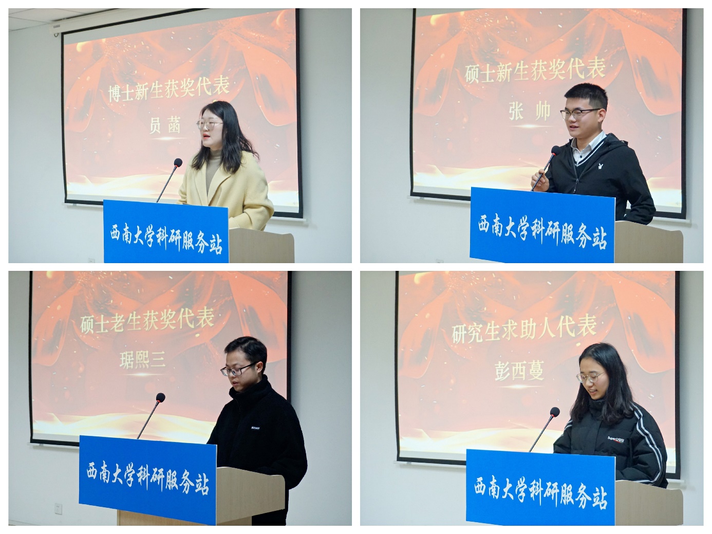 颁奖典礼第三项,分别由公司博士生获奖代表员菡同学、高年级硕士生获奖代表琚熙三同学、研究生新生获奖代表张帅同学和研究生求助人代表彭西蔓同学进行发言。员菡博士表示,在过去几个月的科研帮扶工作中,她亲历过服务站从刚组建时的寸步难行到如今的硕果初结,内心感慨万千,亦收获满满,她认为帮助学弟学妹们走出科研困境是一件非常幸运而又温暖的事,她希望自己能够继续为大家撑好这把“伞”。琚熙三同学感慨道,服务站组建时间虽然不长,但服务站始终紧紧围绕着求助同学的实际需求来实施援助,把力量用在了同学们最需要的地方,这种热爱科研的氛围和志愿服务师生的精神也给了自己很大鼓励,他希望今后能通过服务站帮助更多弟弟妹妹们解决科研瓶颈。张帅同学表示,服务站勇担时代大任的作为是十分令人鼓舞和振奋的,希望借此机会呼吁广大研究生以实际行动践行初心使命,助力他人、成就自我,并坚信服务站能够帮助更多有科研困惑的同学,续写新的辉煌。彭西蔓同学感慨道,在第一次向服务站发出求助时,是抱着试一试的态度,没想到很快就收到了服务站的援助,并且此后的每一次求助,服务站客服都会贴心指导,不仅解决了问题,更传递了温暖,真诚地希望服务站不断壮大,帮助更多求助人解决科研烦恼。