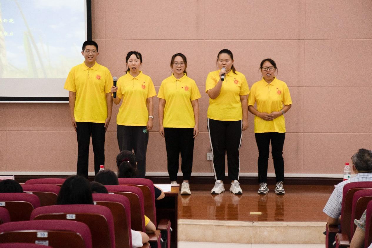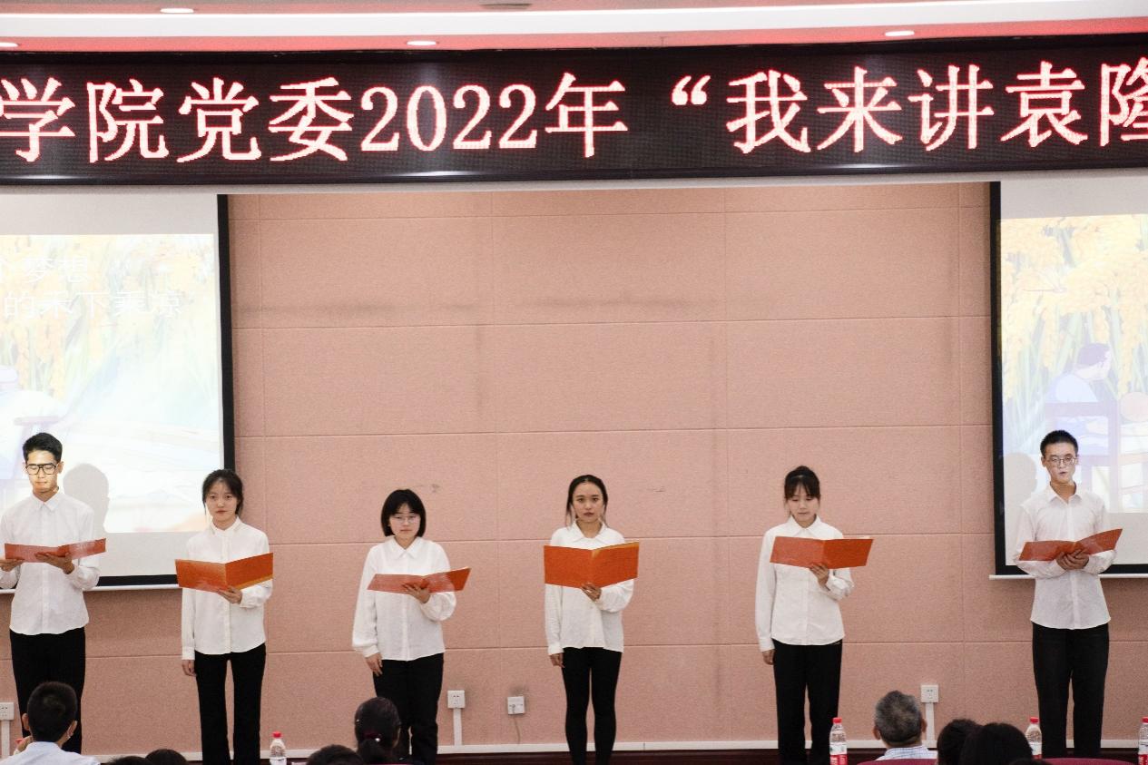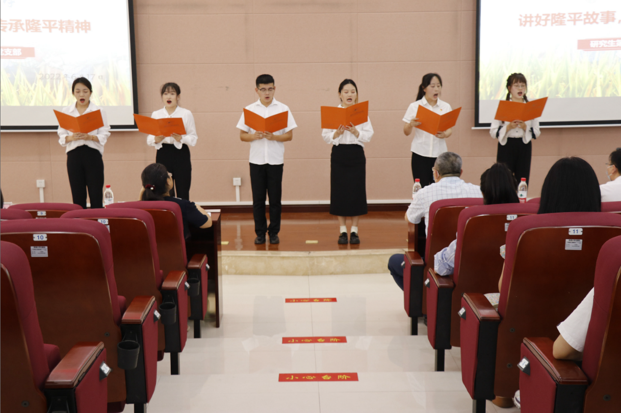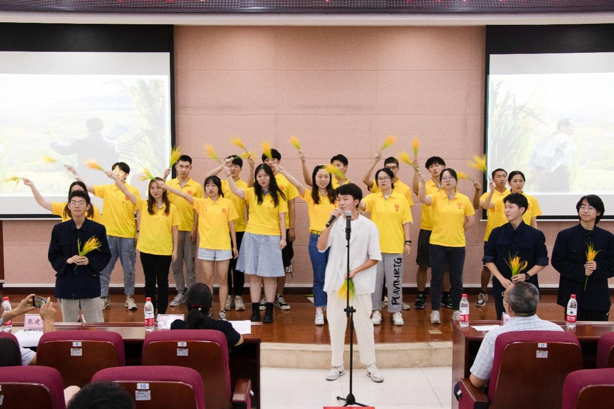 “当微风拂过稻花,稻香飘过您的雕像,想告诉您,我们今年又是丰收。今天,站在报告厅的舞台上,我们手中攥着稻穗,高声朗朗,抒发对您的敬仰。”“先生之风,山高水长;斯人已逝,精神长存。让我们做那点点星光,以青春的姿态,站在巨人的肩膀上,将梦想延伸至前人未曾触及的远方。用一生种子的梦想,完成一生种子的归根。”研究生一支部、三支部、本科区域支部的同学分别带来了《袁老,您好》《袁隆平精神——中国脊梁》《追寻袁老足迹,接力砥砺前行》诗歌朗诵,同学们以饱满的激情把对袁老的崇敬之情表达得淋漓尽致。