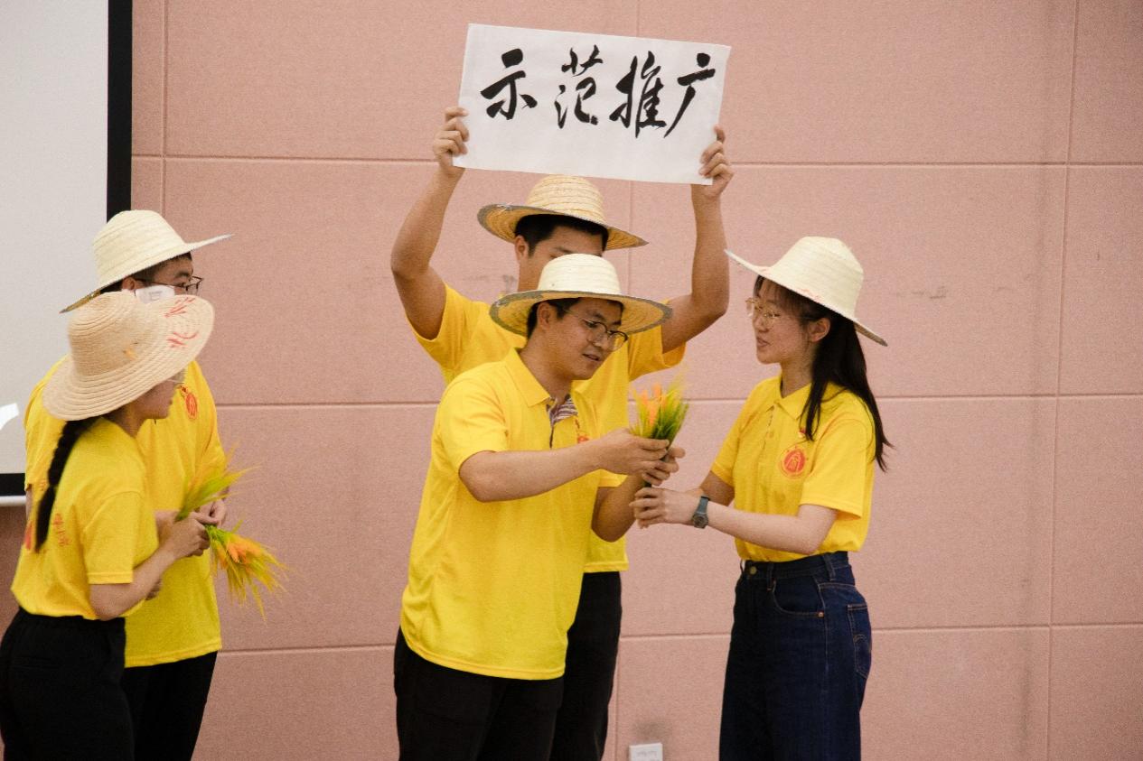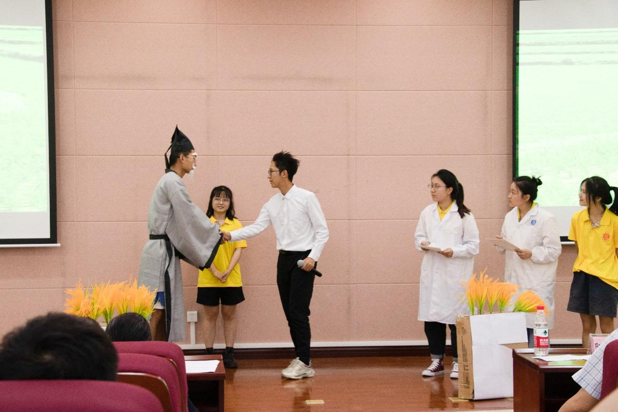 本科植科党支部则带来了形式丰富的一场表演,在《稻香》悠扬的旋律里,同学们立下铮铮誓言,要做袁隆平院士的坚定继承人与传承者,做一粒好种子,以风华之姿书写中国农业发展的璀璨篇章。本科农学二支部演了一出古今交融的舞台剧《“稻”梦空间》,将袁隆平院士与古人宋应星先生放在一块田里,听古今稻神的相互寄托,相互守望。同学们栩栩如生的表演引得现场一片掌声。