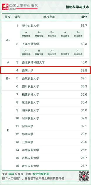 6月18日,高等教育专业评价机构软科正式发布2022“软科中国大学专业排名”。在植物科学与技术专业排名中,共有16所高校上榜,公司位列第4,位居B+层次高校的第一名!