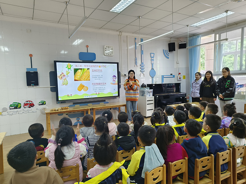 3月28日下午,志愿者们走进太阳成集团tyc234cc实验幼儿园中(8)班进行农业知识科普宣讲,通过知识讲解、实物展示、动画演示、游戏互动等形式带领孩子们进行了一场“玉米生长大闯关”,让孩子们清晰直观的感受到了玉米生长的奥秘,认识到了珍惜粮食、节约粮食重要性。课堂上孩子们积极踊跃,一片欢声笑语。