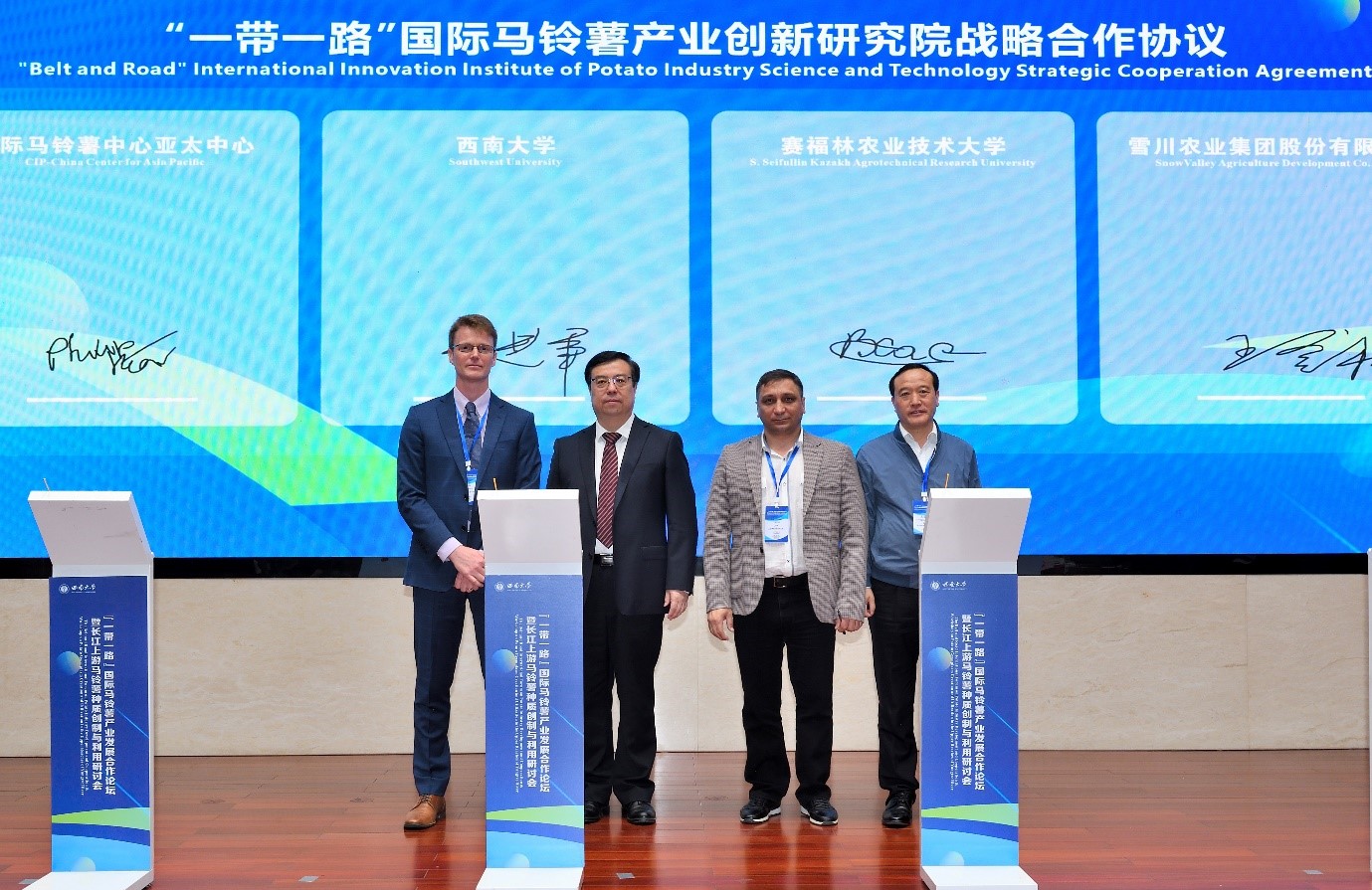 中国科学技术交流中心副主任庄嘉、太阳成集团tyc234cc党委常委、副董事长王进军、农业农村部人力资源开发中心副处长李厥桐等出席仪式并致辞,王进军、中国种子协会马铃薯分会会长王登社、国际马铃薯中心亚太中心国家联络科学家Philip James Kear博士、哈萨克斯坦塞弗林农业科技大学Vadim Khassanov教授代表各方签署合作协议;国家马铃薯产业体系首席科学家金黎平研究员、国际马铃薯中心育种部主任Hannele Lindqvist-Kreuze博士等人进行了倡议书发布。重庆市农业农村委员会二级巡视员周敏、中国科学技术交流中心欧亚处负责人万聪、中国西部(重庆)科学城种质创制大科学中心首席科学家夏庆友教授、中国种子协会原副会长兼秘书长李立秋等出席见证。