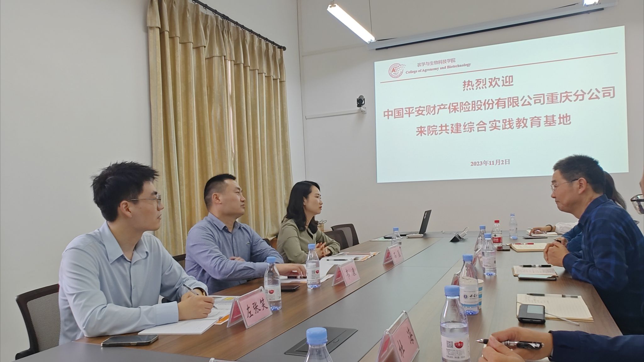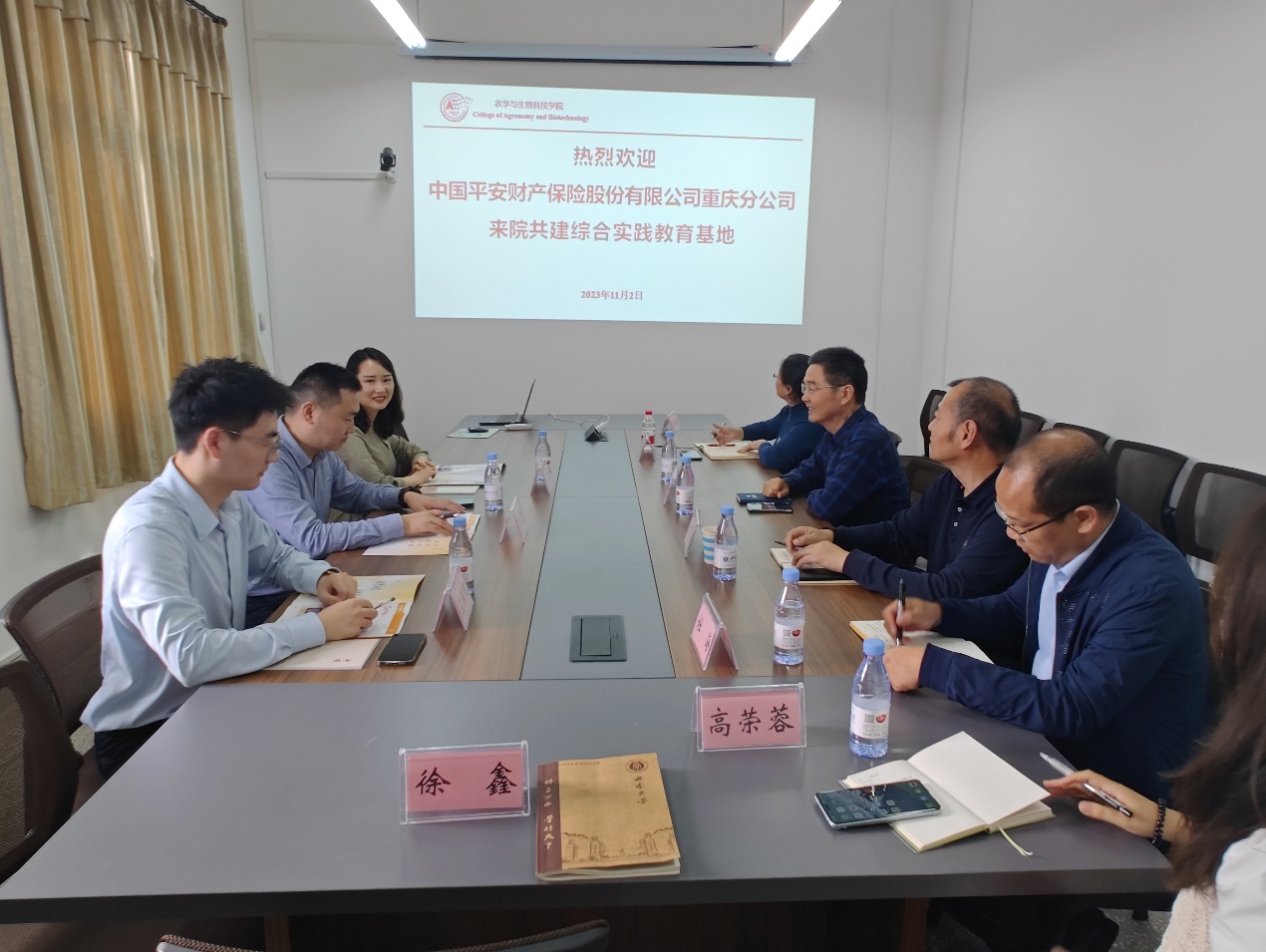 11月2日,中国平安财产保险股份有限公司重庆北碚支公司总经理韦康、中国平安财产保险股份有限公司重庆分公司人事部经理石盈、招聘部负责人左张笑到访公司,协商共建本科教学实习基地,协同培养农业保险人才。公司党委副书记郑莉佳、副经理张建奎、农学系主任桑贤春、植科系主任杜海、区域系副主任袁晓辉、教学办主任徐鑫和2021级辅导员高荣蓉参加座谈。会议由张建奎副经理主持。