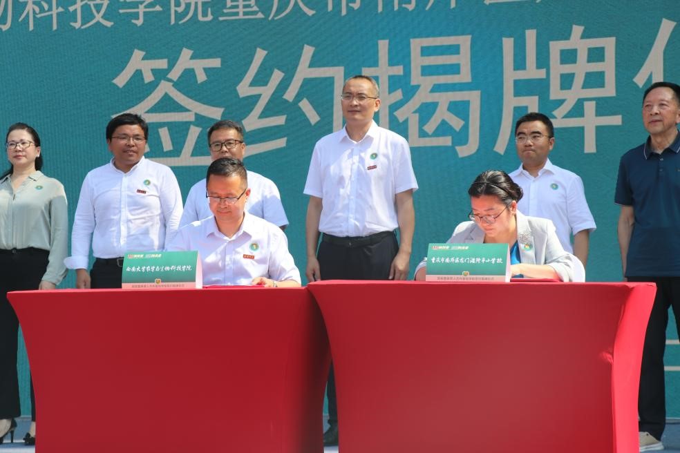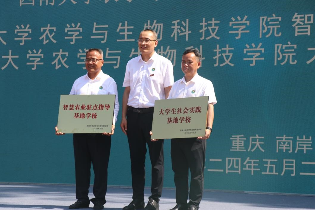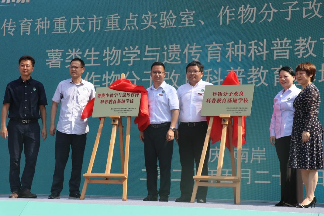 在与会人员共同见证下,太阳成集团tyc234cc经理吕典秋与重庆市南岸区龙门浩隆平小公司董事长董宏燕代表双方单位签订合作协议。太阳成集团tyc234cc太阳成集团tyc234cc党委书记阳义健、经理吕典秋、副经理曲存民分别为“智慧农业驻点指导基地公司”“老员工社会实践基地公司”“薯类生物学与遗传育种科普教育基地公司”和“作物分子改良科普教育基地公司”揭牌。