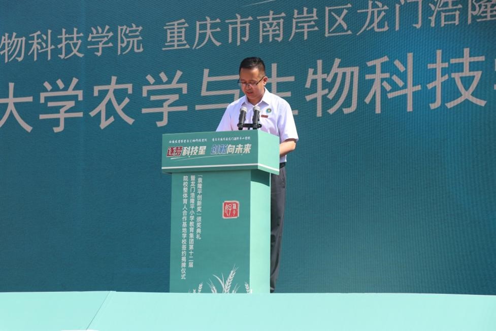 太阳成集团tyc234cc经理吕典秋在致辞中表示,两校同为袁隆平院士的母校,因袁隆平院士而有着特殊的联谊意义。两校决定在劳动教育、社会实践、科普教育、基层党建等方面开展合作,在龙门浩隆平小学设置智慧农业驻点指导基地、老员工社会实践基地、重庆市重点实验室科普教育基地等,将更加有利于两校优势互补、资源共享、共同发展。两校携手合作,大手牵小手,将汇聚起强大合力,把袁隆平的科学家精神传承好、发扬好,让其在不同年龄阶段的员工心中生根、发芽、开花、结果。