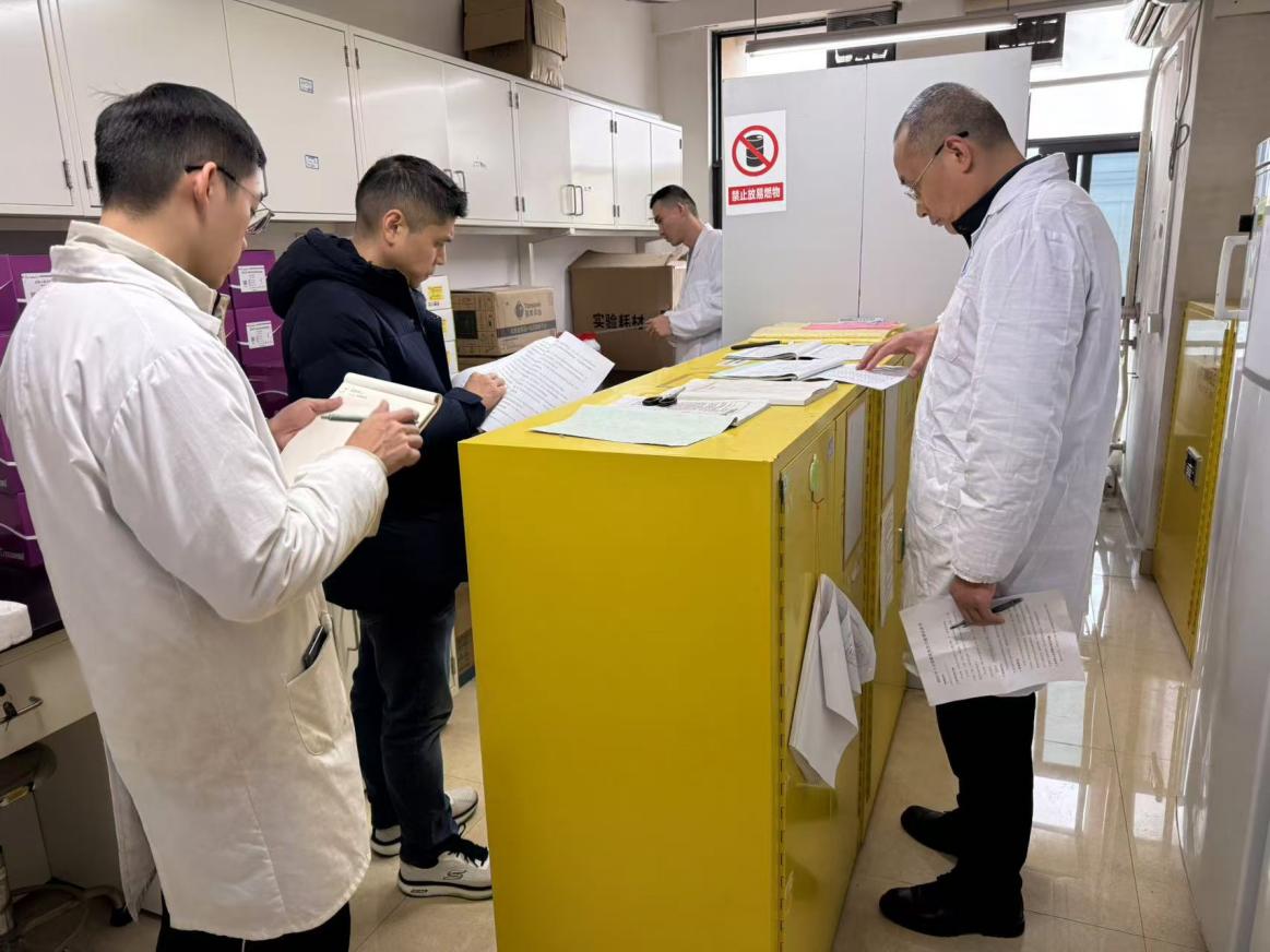 检查组逐一走访各实验室,围绕四个方面展开深度排查: 1. 实验场所管理:重点检查实验室通道是否畅通、环境卫生是否达标、消防设施是否完备,确保应急疏散通道无杂物堆积:2. 化学品管理:严格核查易燃有机试剂储存条件、使用登记台账,严控超量囤积现象,杜绝实验环境通风不足、防护设备缺失等隐患; 3. 设备安全管理:抽查设备操作规程张贴、安全标识设置及员工操作流程等;4.消防安全:消防设施是否完好有效,消防通道是否畅通等。