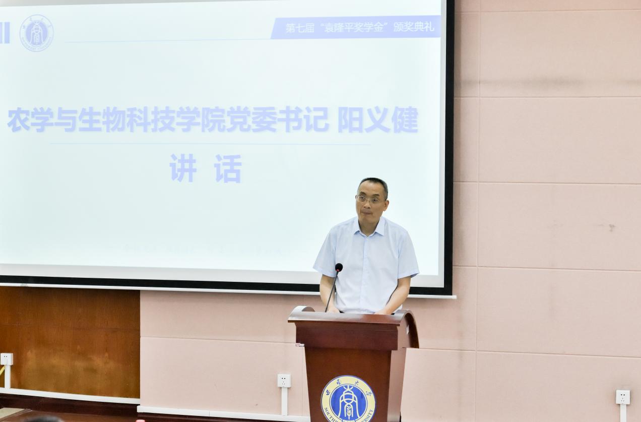 公司党委书记阳义健在讲话中指出,奖学金设立至今已开展七届评选,共65名学子获此殊荣,2024年公司李加纳教授更以个人薪资捐资20万元,助力袁隆平精神传承延续。他向在场的同学们提出三点希望:一是立大志、担大任,主动把握生物育种、智慧农业等科技前沿方向,在乡村振兴的时代征程中勇挑重担,争做农业科技创新的主力军;二是下苦功、练本领,充分依托科研实验室、各级创新竞赛等平台,夯实专业基础、提升创新素养,在实践淬炼中拓宽知识视野;三是接地气、干实事,牢记“把论文写在大地上”的谆谆教诲,主动走进田间地头,在试验田中找答案、在泥土里积累经验,将理论知识转化为服务“三农”的真才实学。讲话最后,阳义健书记号召广大青年学子以袁隆平精神为指引,把个人理想融入国家发展大局,在农业现代化建设中挥洒青春汗水,为实现“禾下乘凉梦”“杂交水稻覆盖全球梦”贡献青春力量。