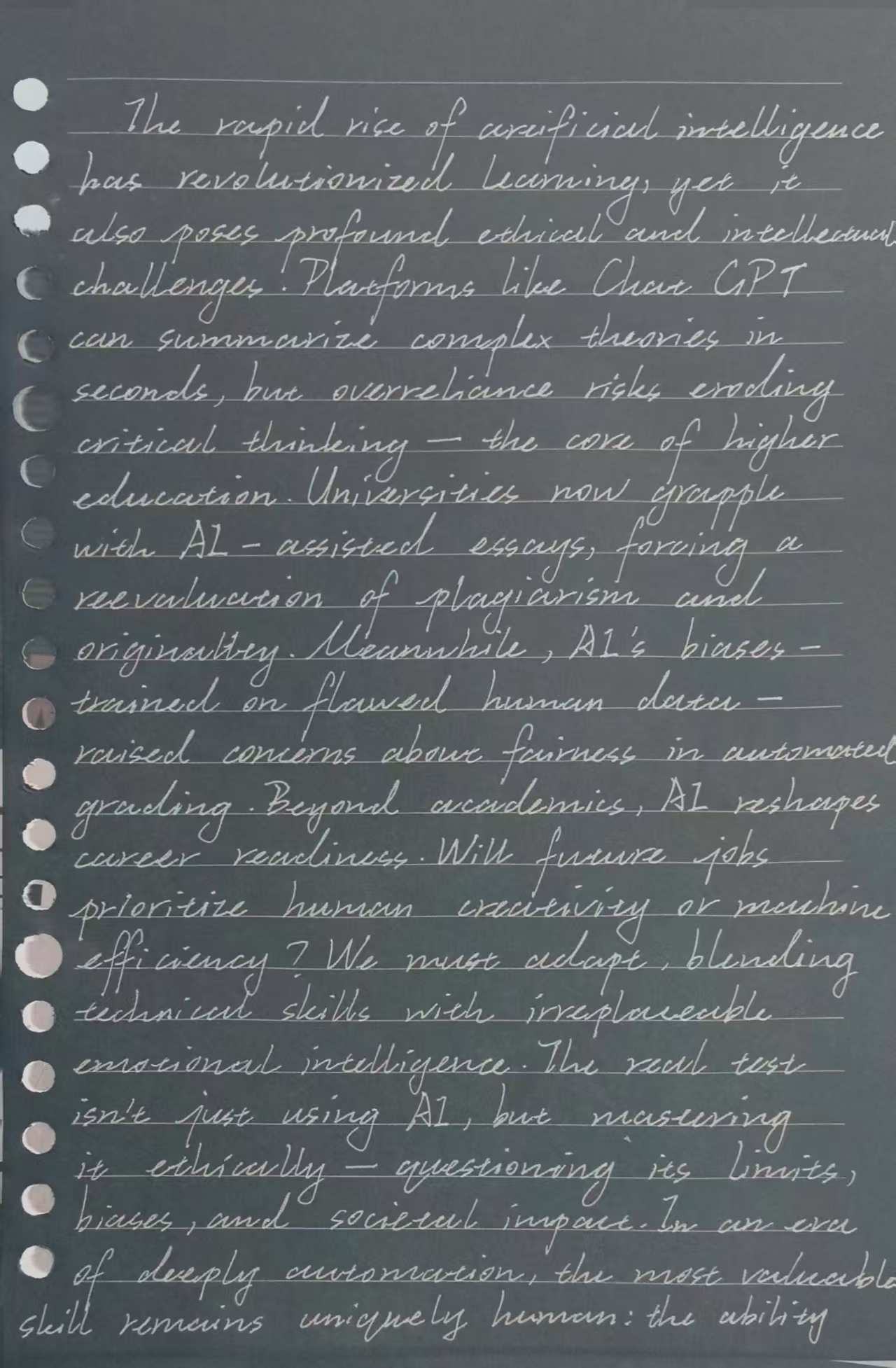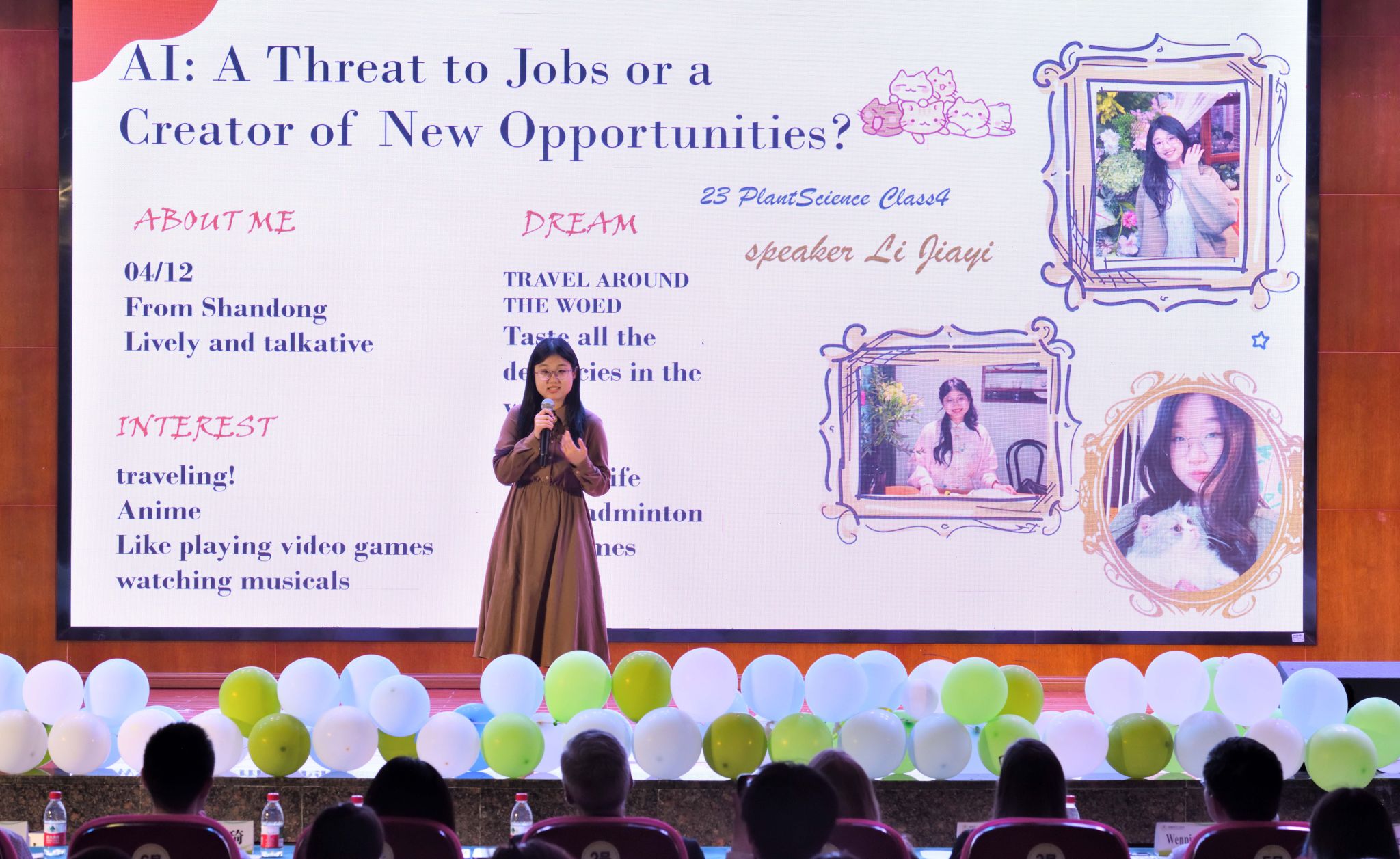 在个人演讲环节,六位选手围绕“AI: A Threat to Jobs or a Creator of New Opportunities?”(AI是就业威胁还是新机遇的创造者?)主题展开激烈角逐。选手们需在5-8分钟内,以清晰的逻辑、流畅的表达和稳健的台风,阐述对人工智能与就业关系的辩证思考。他们凭借扎实的语言功底和卓越的表现力,赢得现场评委与观众的高度赞誉,充分彰显了在语言学习与跨文化交流方面的深厚积淀。