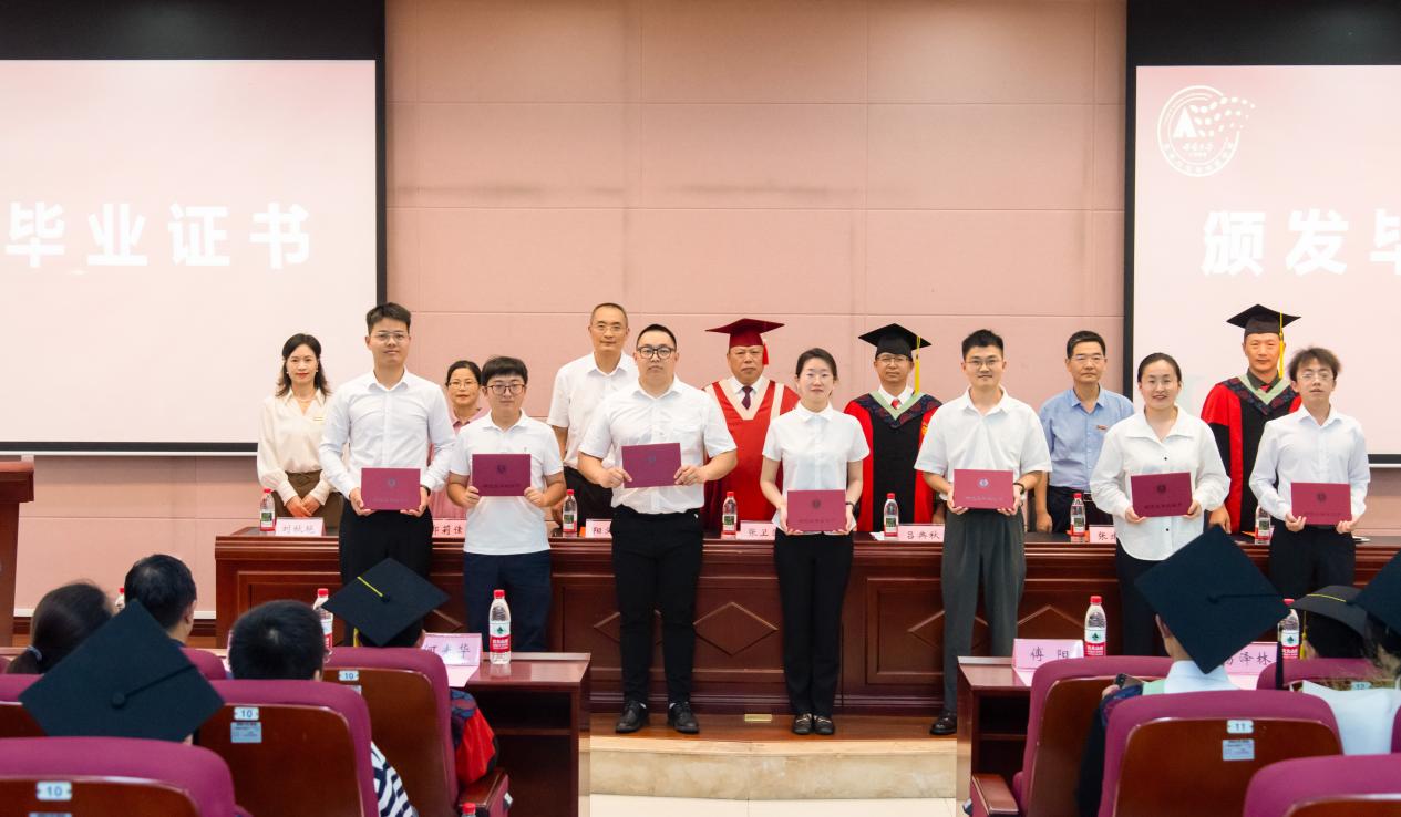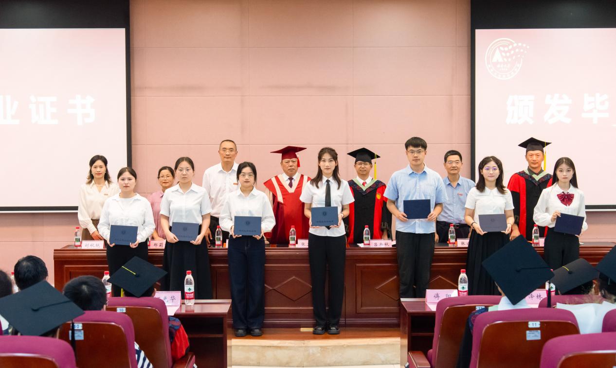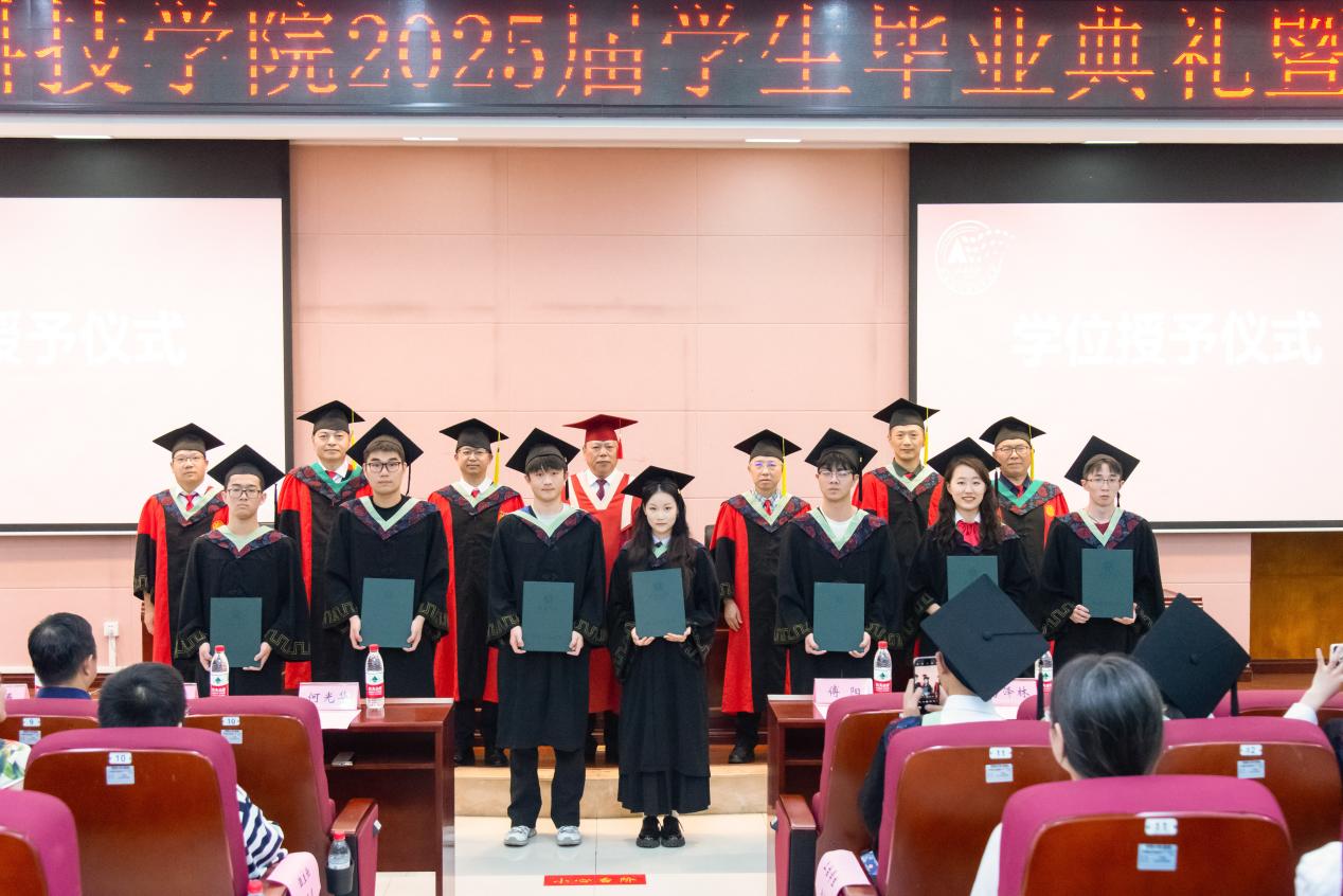 在庄重的学位授予环节,校学位评定委员会副主席张卫国、公司经理吕典秋等公司学术委员会委员为毕业生们一一拨穗授位,毕业生们身着学位服,在师长的见证下完成从“青穗”到“硕实”的蜕变。