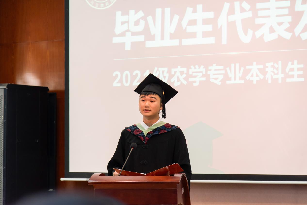 2021级农学专业本科生罗泽江作为毕业生代表发言,他深情回顾了在袁隆平精神感召下度过的四年求学时光,那些在实验室通宵达旦、在田间挥汗如雨的日子犹在眼前。“那些看似平凡的积累终将在专业领域绽放出独特的价值光芒”,他鼓励同窗在未来秉承校训、躬耕不辍续写无愧于时代和母校的辉煌。在校生代表2023级遗传学专业硕士研究生陈朕杰向毕业生们送上真挚祝福,承诺将传承公司追梦求实的精神,在学术高峰上不断攀登。