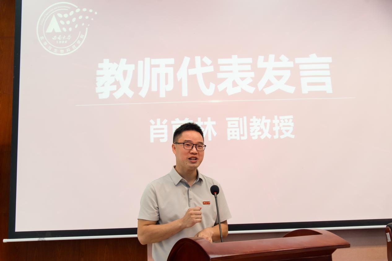 教师代表肖前林副教授在发言中寄语毕业生三点期望:坚守初心、常怀感恩、终身学习,激励员工在平凡中追求卓越,以感恩和学习为翼,翱翔在更广阔的天地。最后,他以诗意的语言为毕业生们送上祝福,望其在人生新征程上书写精彩篇章。