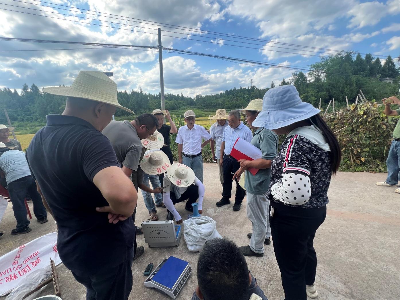 调研现场,由重庆市农业科学研究院、重庆市农业技术推广总站、重庆市种子站、梁平区农技推广服务中心、忠县农业科技推广中心等单位骨干组成的专家组,严格按照《粮油作物实收测产办法(试行)》规范流程,经过严谨细致的机收面积测量、稻谷称重、除杂及含水量测定等,计算后,示范田水稻平均亩产达到757.67公斤,较对照田增产18.4%。秦大海副主任对水稻技术集成成效给予肯定。