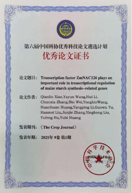 根据《第六届中国科协优秀科技论文遴选计划实施方案》,经过各学科领域专家推荐、初评遴选、终评审定并向社会公示,最终确定95篇论文获评2021年度优秀科技论文。公司肖前林博士发表于Crop Journal(2021, 9: 192-203)的一篇题名为“Transcription factor ZmNAC126 plays an important role in transcriptional regulation of maize starch synthesis-related genes”的论文,成功获评中国科协优秀科技论文遴选计划农林集群“特等奖”,暨第六届中国科协优秀科技论文。