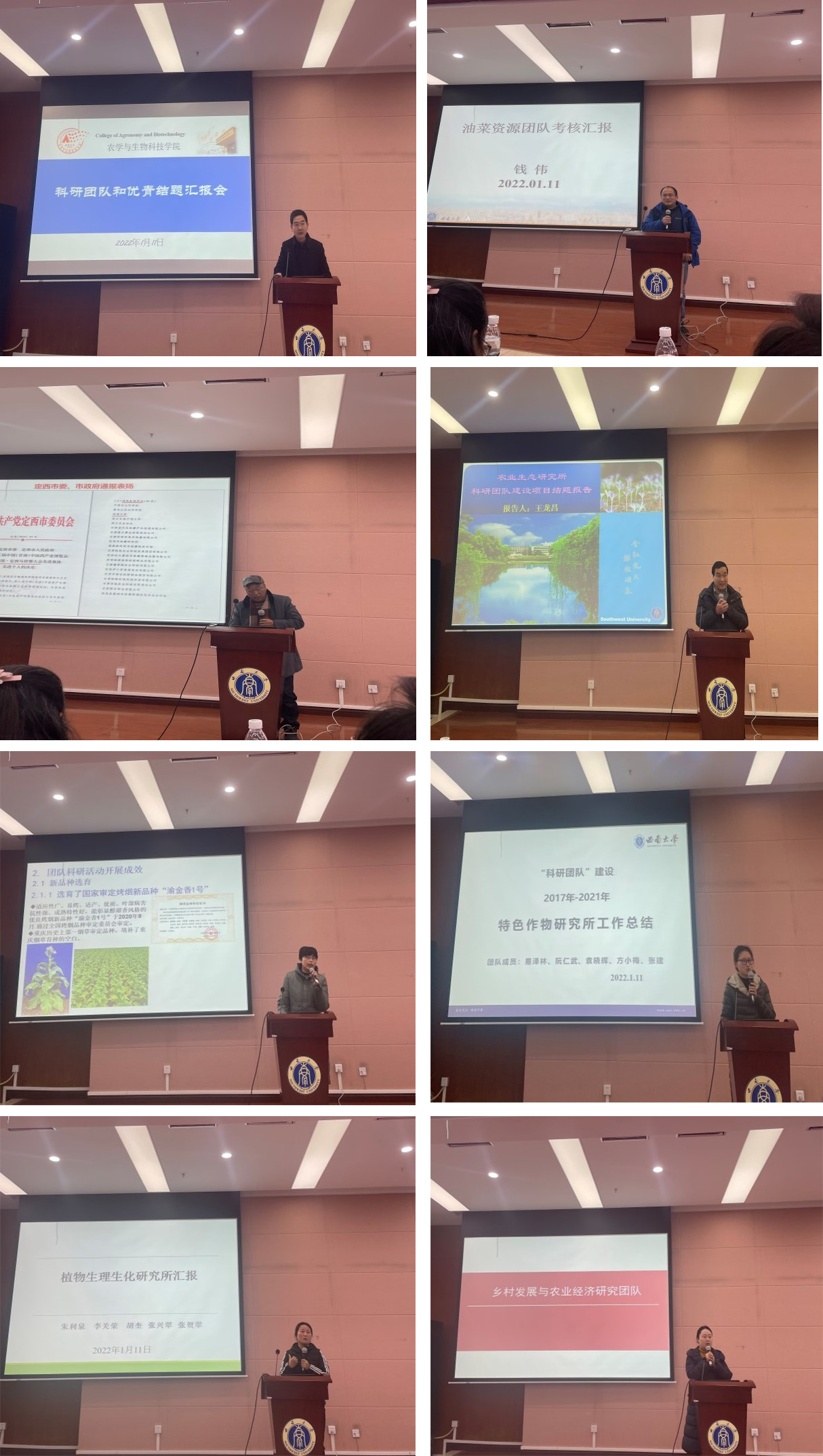 公司11个团队,水稻研究所、油菜分子育种研究所、棉花研究所、薯类作物研究所、油菜资源研究所、玉米研究所、农业生态研究所、烟草研究所、特色作物研究所、植物生理生化研究所和乡村发展与农业经济研究团队的负责人分别进行了汇报,总结了团队建设与人才培养、科研项目、代表性研究成果、成果推广应用和社会服务、学术交流等情况,剖析了团队存在的问题,并提出了下一步工作计划和设想。