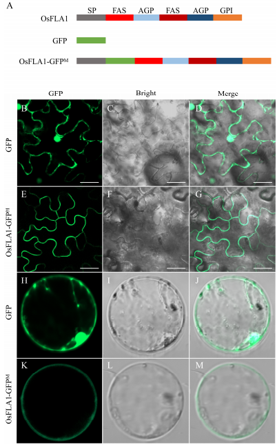 研究表明,OsFLA1基因编码一种FLAs蛋白,在水稻花药中高表达,亚细胞定位显示OsFLA1在质膜中定位。花粉的两层壁细胞可帮助花粉抵御各种生物胁迫及非生物胁迫,从而保证花粉行使其正常生物学功能。OsFLA1的研究结果表明类成束阿拉伯半乳糖蛋白在水稻雄性生殖发育中发挥着十分重要的作用。