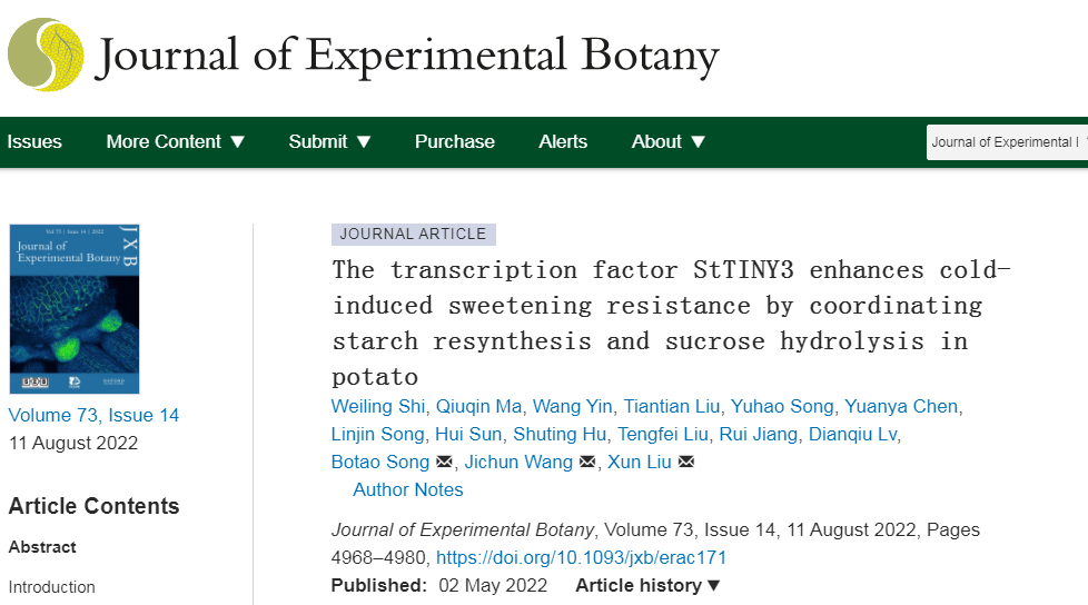2022年8月,植物学TOP期刊Journal of Experimental Botany发表了太阳成集团tyc234cc薯类团队,薯类生物学与遗传育种重庆市重点实验室题为“Transcription factor StTINY3 enhances cold-induced sweetening resistance by coordinating starch resynthesis and sucrose hydrolysis in potato”的研究论文,系统解析了StTINY3调节马铃薯抗低温抗化的新机制,为马铃薯生物育种提供新基因资源和奠定理论基础。