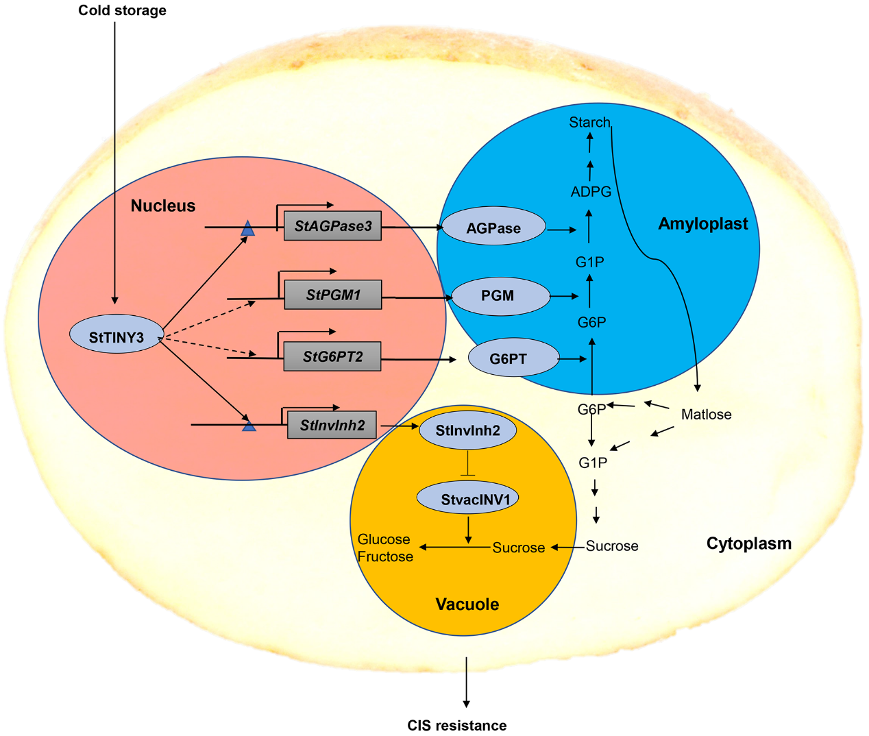 前期团队通过比较转录组学研究揭示了低温贮藏块茎中促进淀粉再合成和抑制蔗糖水解途径的选择主要贡献了低温糖化抗性(Liu et al., Food Chemistry, 2021)。鉴定了转录因子StRAP2.3直接靶向StInvInh2抑制蔗糖水解途径,在蔗糖代谢途径调节低温糖化的抗性分子模型(Shi et al., Horticultural Research, 2021)。本研究进一步鉴定了转录因子StTINY3能同时调节StAGPaseL3, StG6PT2, StPGM1和StInvInh2等基因,促进G-6-P流向淀粉合成和减弱其流向蔗糖和还原糖合成,从而提高马铃薯低温糖化抗性的新机制。