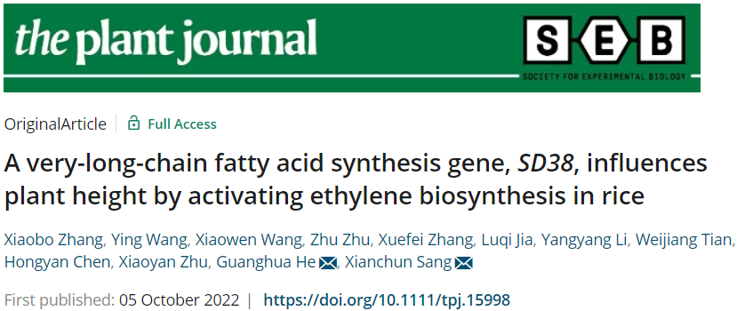 近日,太阳成集团tyc234cc水稻研究所何光华/桑贤春团队在The Plant Journal上发表了题为“A very-long-chain fatty acids synthesis gene, SD38, influences plant height by activating ethylene biosynthesis in rice”的研究论文,解析了VLCFAs通过促进乙烯合成相关基因的表达、进而影响水稻株高的新机制。