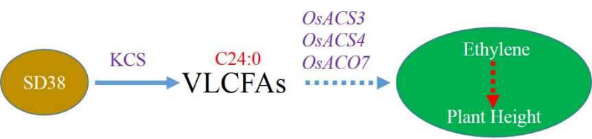 本研究从EMS突变体库中鉴定到一个全生育期内都半矮化的突变体sd38(semi dwarf 38),显微观察发现细胞变短是其半矮化的原因。SD38编码参与VLCFAs合成的β-酮脂酰-CoA合酶(β-ketoacyl-CoA synthase,KCS)。脂肪酸含量测定和酿酒酵母的异源表达实验证明SD38参与C24:0 VLCFA的延伸。进一步研究发现乙烯合成相关基因在sd38中的表达量下降,导致了体内乙烯合成前体物质ACC含量极显著下降。外源脂肪酸诱导实验发现C24:0 VLCFA能够诱导OsACS3、OsACS4和OsACO7的表达,而唑草胺抑制其表达。因此,认为SD38参与C24:0 VLCFA的合成,通过调控乙烯的含量影响水稻株高。这一发现拓展了对株型调控的新认知,丰富了株高形成的分子机理。