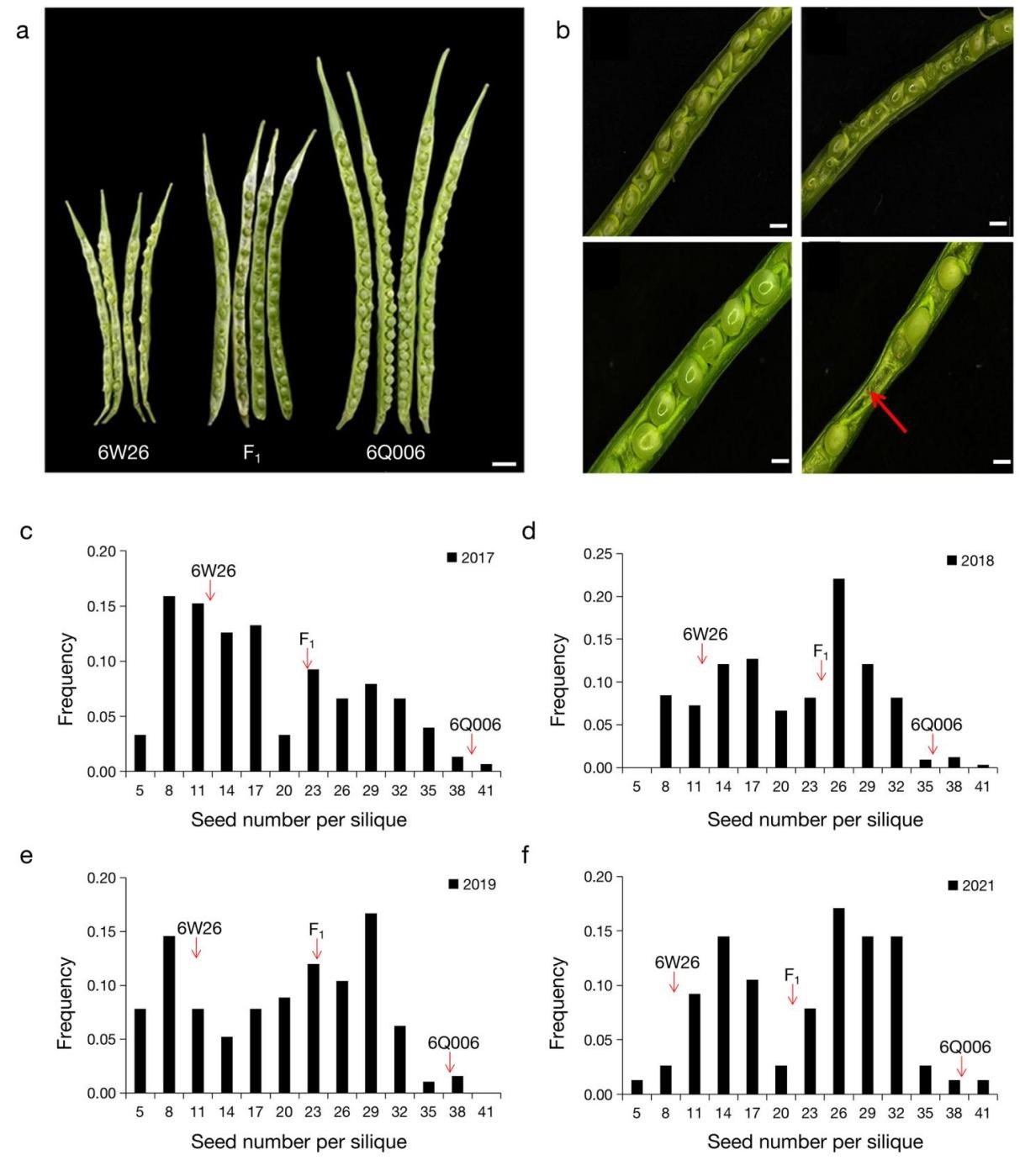 该团队在The Crop Journal在线发表题为“Identification of a candidate QTG for seed number per silique by integrating QTL mapping and RNA-seq in Brassica napus L.”的研究论文中,发现受精后14天的种子败育是一份粒数达40粒和一份粒数仅10粒的种质资源每角果粒数差异形成的原因。利用两亲本衍生而来的DH群体进行QTL检测,在C09染色体检测到一个主效位点qSNPS.C09,可解释28.77%~60.64%的表型变异。通过BSA分析和转录组分析,在qSNPS.C09区间内挖掘到一个差异表达基因BnaC09g45400D(BnaC09.APT5)。该基因启动子区48 bp的插入序列,导致该基因在多粒和少粒材料授粉后14 天的角果中差异表达,并引起每角果粒数的不同。转录组分析结果表明,该基因可能通过细胞分裂素相关的代谢途径调控每角果粒数。该研究不仅加深了我们对油菜每角果粒数调控分子机理的理解,而且为油菜高产育种提供了新的目标基因。