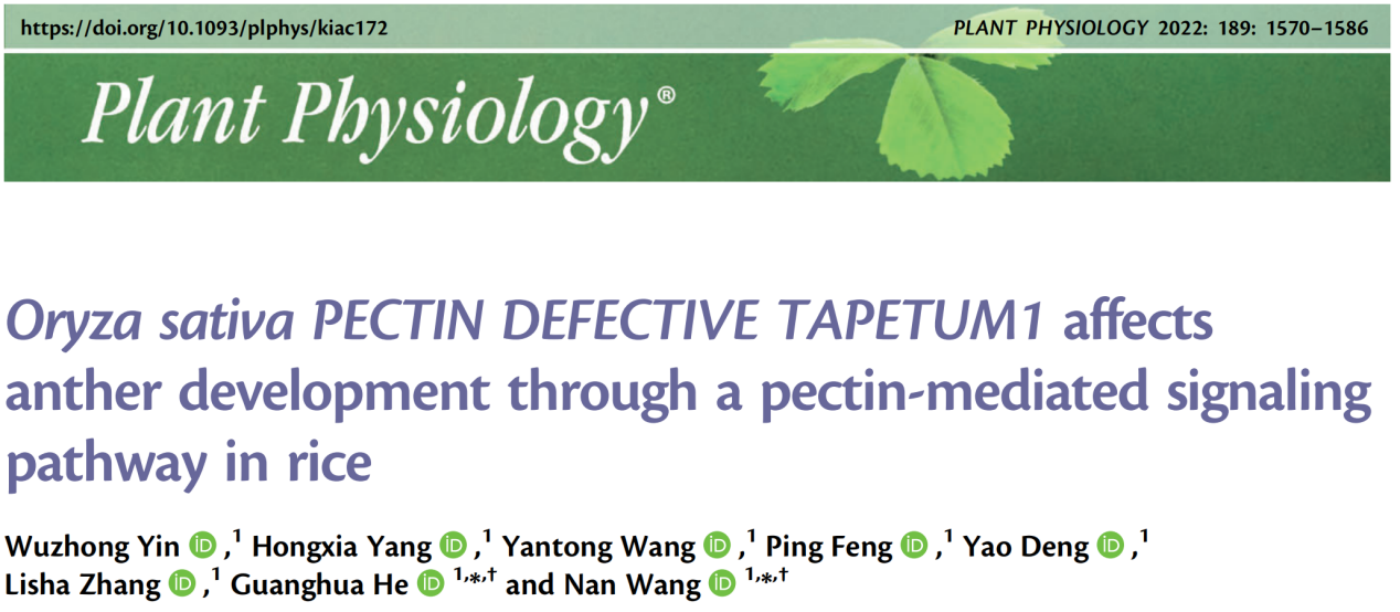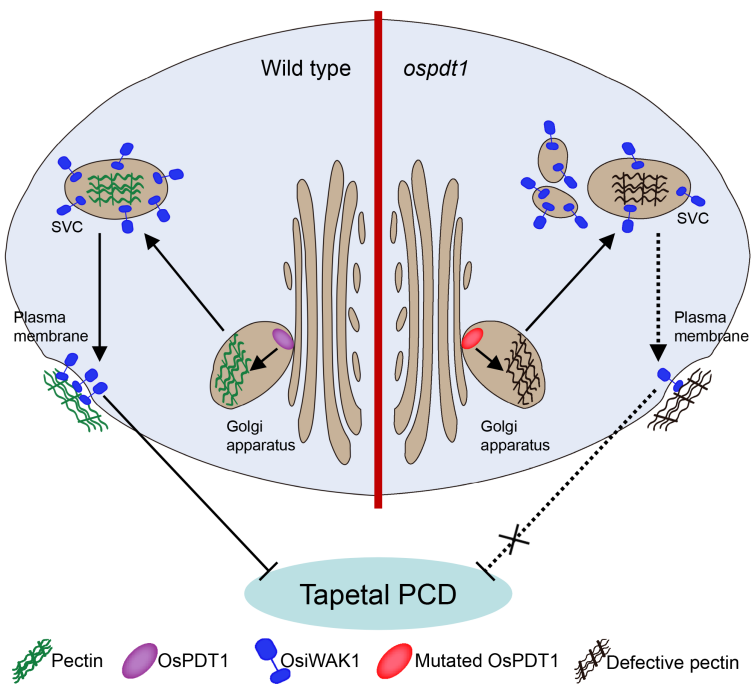 2022年4月19日Plant Physiology ( IF2021=8.005) 在线发表了太阳成集团tyc234cc水稻研究所的最新研究成果“Oryza sativa PECTIN DEFECTIVE TAPETUM1 affects anther development through a pectin-mediated signaling pathway in rice”。该研究以果胶合成相关的半乳糖醛酸基转移酶突变体oryza sativa pectin defective tapetum1 (ospdt1)为研究对象,发现它的绒毡层细胞程序性死亡(PCD)提前,并产生了完全败育的花粉粒。与其它发生果胶缺陷的突变体不同,ospdt1突变体的果胶含量与野生型差异较小,起结构支撑作用的细胞壁果胶没有明显的缺陷。进一步研究发现WAK家族蛋白OsiWAK1在ospdt1突变体细胞内的分布受到了影响,OsiWAK1的敲除植株与ospdt1突变体出现了相似的绒毡层PCD提前,在ospdt1背景的水稻中超表达OsiWAK1部分恢复了ospdt1的缺陷。因此,该研究认为ospdt1突变体中的果胶合成缺陷影响了OsiWAK1蛋白在细胞内与果胶的整合与运输,进而影响了其功能,并导致绒毡层PCD提前。这一发现为植物体内的果胶如何发挥其生物学功能提供了新的见解(图3)。