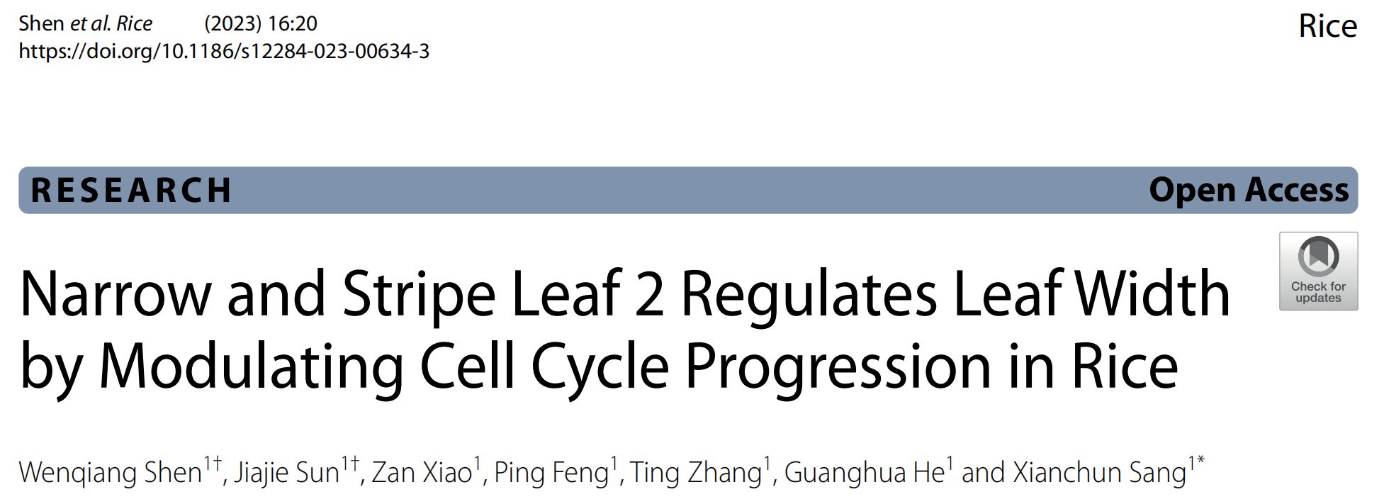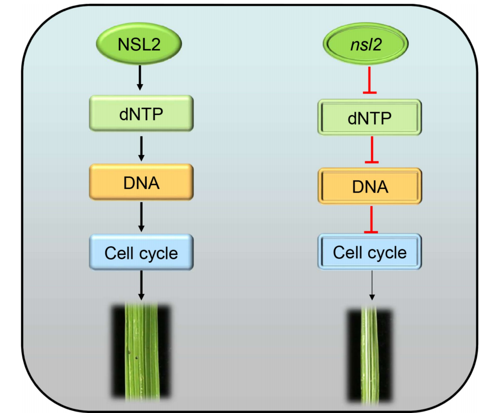 叶片形态是水稻株型的重要组成部分,对光合作用、蒸腾作用及产量有着重要影响。太阳成集团tyc234cc水稻研究所从EMS诱变体库中分离鉴定到一个水稻隐性窄条纹叶突变体nsl2 (narrow and stripe leaf 2),并据此图位克隆了目的基因NSL2,编码核糖核苷酸酶小亚基RNRS1。前人研究表明RNRS1参与调控水稻叶色及花器官的发育,但在叶型发育中的功能还未知。我们进一步研究发现,NSL2/RNRS1通过影响dNTP的合成,进而阻碍DNA的合成,导致细胞分裂速率降低,从而调控叶片宽度,这为进一步阐释RNRS1功能奠定了基础。该研究“Narrow and Stripe Leaf 2 Regulates Leaf Width by Modulating Cell Cycle Progression in Rice”近期发表在农学一区杂志《Rice》上,2022IF=5.638。博士后沈文强老师为第一作者,2018级隆平班本科生(农学专业)孙佳婕为共同第一作者,桑贤春老师为通讯作者。该论文受到了重庆市博士后科学基金(cstc2021jcyj-bshX0076)、国家自然科学基金(32171964)和重庆市自然科学基金创新群体(cstc2021jcyj-cxttX0004)项目的资助。