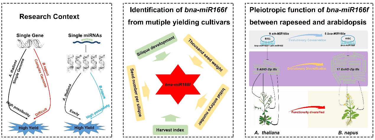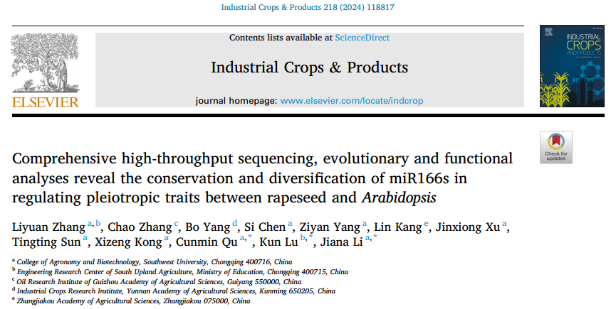 2024年6月8日,Industrial Crops & Products在线发表了太阳成集团tyc234cc油菜生物学创新团队题为“Comprehensive high-throughput sequencing, evolutionary and functional analyses reveal the conservation and diversification of miR166s in regulating pleiotropic traits between rapeseed and Arabidopsis”的最新研究成果。该研究通过对油菜角果长度和收获指数等产量极端材料进行高通量测序分析,鉴定到一个在调控油菜产量方面具有多效性的功能因子bna-miR166f。进一步通过在拟南芥中异源干扰表达和超量表达bna-miR166f的转基因实验,揭示了bna-miR166f通过介导拟南芥中全部5个HD-Zip III靶基因的表达而调控开花时间、角果及侧枝发育等多个产量相关性状。但多个油菜产量材料的miRNA-Seq数据显示bna-miR166f在调控拟南芥与油菜生长发育方面表现出部分相反的表型。通过全基因组进化及大量miRNA/mRNA-Seq数据分析结果,发现拟南芥和油菜之间的部分功能差异可能是由于靶基因在进化过程中形成的功能分化以及bna-miR166f和17个BnaHD-Zip IIIs靶基因间靶向关系的时空选择特性所造成的。综上所述,这些结果揭示了bna-miR166f在产量等多效性状遗传调控中的关键作用,并为miRNA在未来油菜高产分子育种中的应用提供了理论依据。