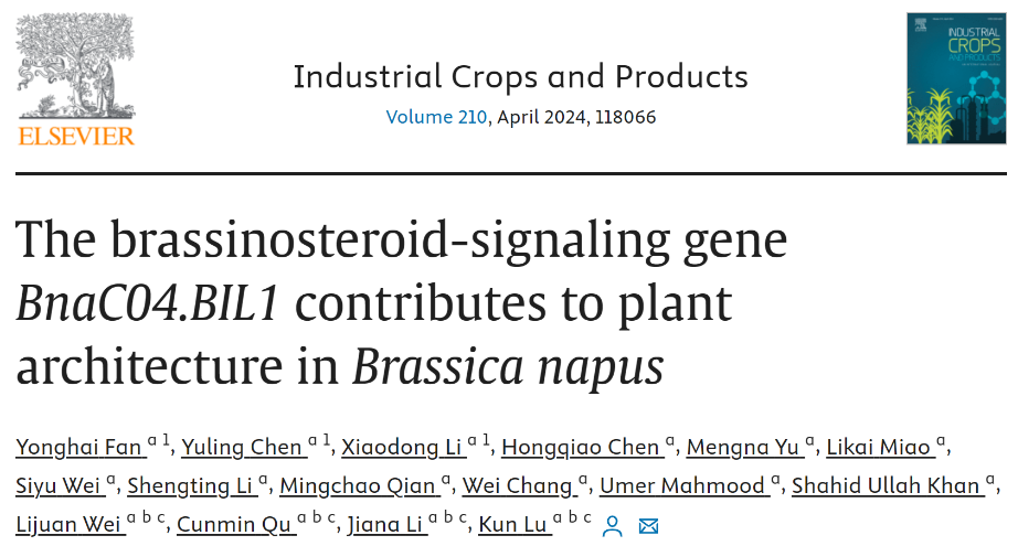 2024年1月8日,Industrial Crops & Products在线发表了太阳成集团tyc234cc油菜生物学团队题为“The brassinosteroid-signaling gene BnaC04.BIL1 contributes to plant architecture in Brassica napus”的最新研究成果。该研究鉴定了一个油菜矮化、紧凑型突变体dac1,该突变体有多种形态缺陷,如矮化、分枝狭窄、开花延迟、叶片深绿且皱缩等。DAC1蛋白与拟南芥BRASSINOSTEROID-INSENSITIVE 2 (BIN2) -LIKE 1 (BIL1)同源,并将其命名为BnaC04.BIL1。研究发现BnaC04.BIL1一个C/T的替换导致编码蛋白第314位脯氨酸(Pro)转变为亮氨酸(Leu),影响BnaC04.BIL1蛋白降解,并通过油菜素内酯信号以剂量依赖的方式抑制株型。进一步在BnaC04.BIL1的启动子区域,鉴定了一个11 bp的核心序列和一个影响基因表达的关键碱基。此外,dac1的杂合子为单位点显性,株型呈现出油菜理想株型特点。综上,BnaC04.BIL1的功能获得突变有助于油菜分子育种,为油菜理想株型设计提供了宝贵的基因资源。