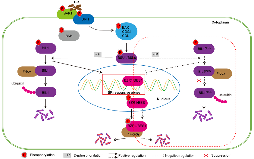图3 BIL1在油菜中抑制油菜素内酯信号传导作用的模型,P314L替换抑制BnaC04.BIL1蛋白降解,阻断BES1/BZR1蛋白释放。全文链接https://doi.org/10.1016/j.indcrop.2024.118066.