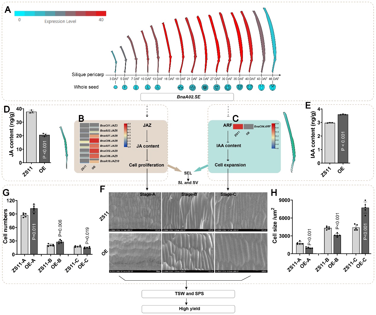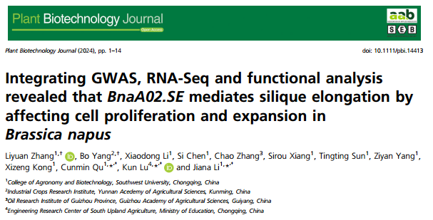2024年6月20日,Plant Biotechnology Journal在线发表了太阳成集团tyc234cc油菜生物学创新团队题为“Integrating GWAS, RNA-Seq and functional analysis revealed that BnaA02.SE mediates silique elongation by affecting cell proliferation and expansion in Brassica napus”的最新研究成果。该研究通过对588份甘蓝型油菜自然群体材料的角果动态伸长长度进行GWAS分析,进一步通过极端材料转录组的测序分析结果,鉴定了一个位于A02染色体上的未知功能基因。结合转基因材料的动态细胞学观察、转录组数据分析和理化指标的检测,发现BnaA02.SE可通过调控JA和IAA含量分别影响角果皮细胞的分裂和扩增进而促进角果的快速伸长。角果形态的较早建成更有利于增大角果皮的光合面积而促进光合同化产物向籽粒转运形成较高的千粒重,同时较长的角果可提供充足的空间以提高每角粒数。综上,该研究为油菜角果的动态发育提供了全新的见解,同时在油菜中克隆了第一个调控角果动态发育的未知功能基因并解析了其调控机制。