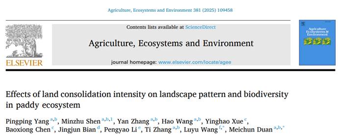 近日 Elsevier旗下知名期刊Agriculture, Ecosystems and Environment(中科院SCI期刊分区农林科学大类1区Top)在线发表了公司段美春课题组关于土地整理强度对稻田生物多样性影响的研究成果。