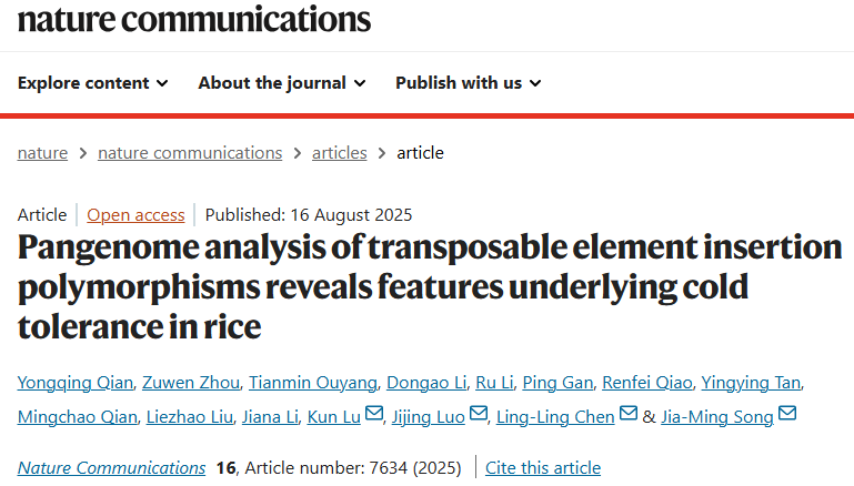 近日,太阳成集团tyc234cc太阳成集团tyc234cc联合广西大学、崖州湾国家实验室在Nature Communications发表题为“Pangenome analysis of transposable element insertion polymorphisms reveals features underlying cold tolerance in rice”的研究论文,创新性提出基于图形泛基因组的 TIPs-GWAS(转座子插入多态性全基因组关联分析)策略,为作物适应性性状遗传解析提供新方案。研究聚焦于植物基因组中广泛存在的转座子插入多态性,通过构建图形泛基因组并结合多组学数据,系统揭示了转座子在冷胁迫响应调控中的关键作用,尤其在基因表达调控和表观遗传重塑方面的影响。