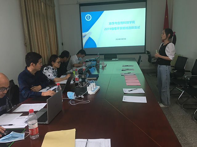 面试综合考察共分为自我介绍、即兴演讲、无领导小组讨论三个环节。主要考察员工的思想状态、专业基础、英语水平及科研潜质等。面试专家针对同学们的综合表现进行打分,最终择优确定进入隆平实验班的员工名单。