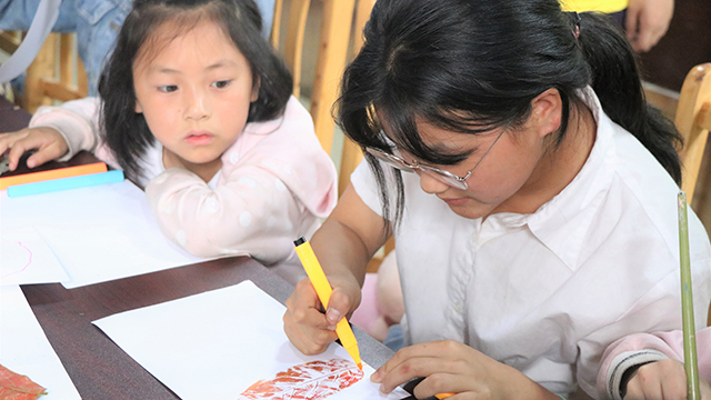 PPT中叶型及叶缘的判断让小朋友们忙得不亦乐乎,银杏和枫叶的判断却让他们稍感迷茫,支教队员的及时讲解令他们恍然大悟。然而,此次的重头戏才刚刚开始,讲解员引导小朋友发挥想象力,进行绘画创作,锻炼其动手能力。