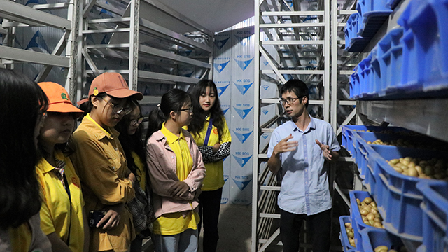登上组培室大楼,队员们被眼前熟悉的场景所触动,研究负责人详细地对公司实验室及基地扩繁材料用具做了区分,“玻璃瓶”及“培养皿”的不同,“蛭石”和“烧炭土”的区别,拓宽了同学们的知识面,让身处课堂的同学们对作物实践有了深刻的认识,激发大家的研究兴趣。