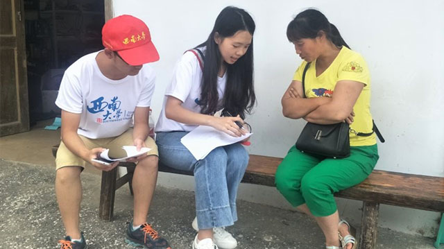 7月16日一大早,小分队便开展了调研。在寻找农户的过程中,队员们发现有许多人来这里避暑。由于地势较高,气候凉爽,木根村的清晨自然成为村民、游客纳凉散步的不二之选。队员们就这个现象进行讨论,并记录入问卷当中。