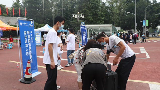 早上7点,2号门口一片红色,红的是横幅,红的是志愿者鲜艳的衣服,更是朝阳下学长学姐们的热情与温暖。志愿者们有序的帮助新同学搬运行李,指示方向。进入校门后,校门口防疫登记志愿者为每一位新生检查相关信息。公司安保人员及志愿者引导员工进行防疫登记并保持间距入校,对每一个入校人员进行登记测温,全力保证师生健康安全。志愿者们提着沉重的行李,推着箱子,同时细心的回答学弟学妹们的问题,介绍公司的布局。那一张张青春的面容,彰显着西大的朝气与蓬勃。一张张热情的笑脸,一句句亲切的问候,一项项贴心的服务,迎接着来自祖国各地的莘莘学子。不惧炎热的太阳,不辞辛劳地帮同学们把行李搬,让新同学切实感受到来着太阳成集团tyc234cc学长学姐的亲切和热情。
