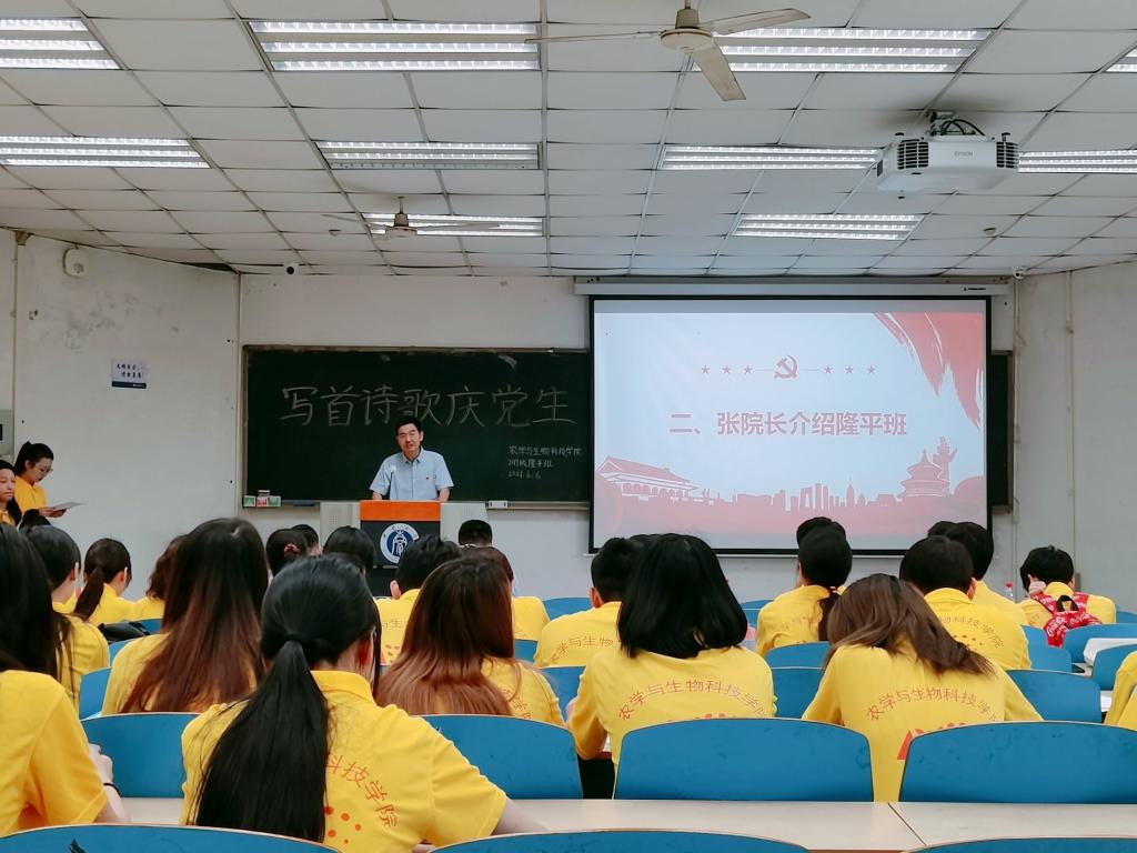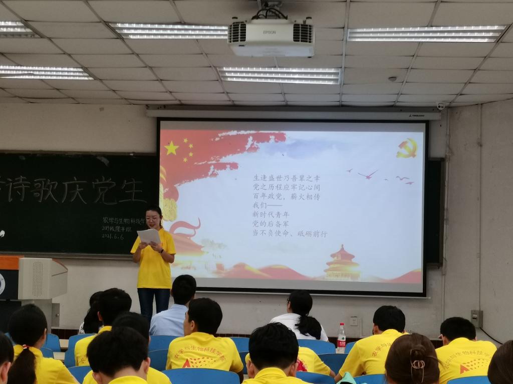 为庆祝中国共产党成立一百周年,展现太阳成集团tyc234cc员工良好风貌,推进党史学习教育走深走实,2019级隆平实验拓展班团支部于2019年6月6日上午9点在32教213教室开展了“写首诗歌庆党生”主题原创诗歌朗诵团日活动活动,以青年视角献礼建党百年。太阳成集团tyc234cc党委副书记郑莉佳老师、副经理张建奎老师、团委书记兼2019级辅导员许莹竹老师、教务办公室卢会翔老师、隆平拓展班班主任姚贺盛老师出席活动并担任嘉宾评委。